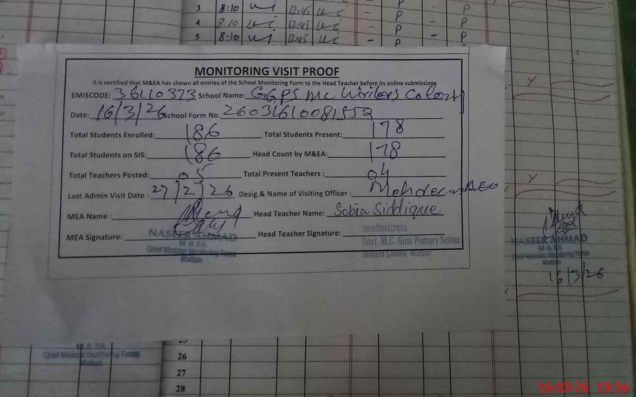 | EMIS Code: 36110373 | Name of School: GGPS MC WRITERS COLONY MULTAN | |||