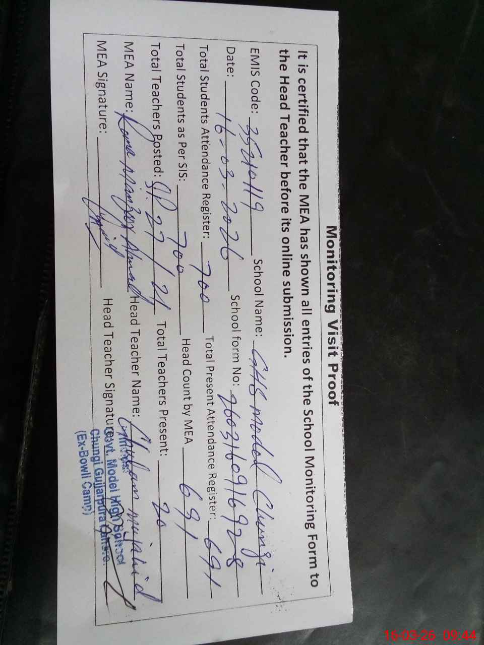 | Attendance Register | Head Teacher | MEA with School | Visit Proof |