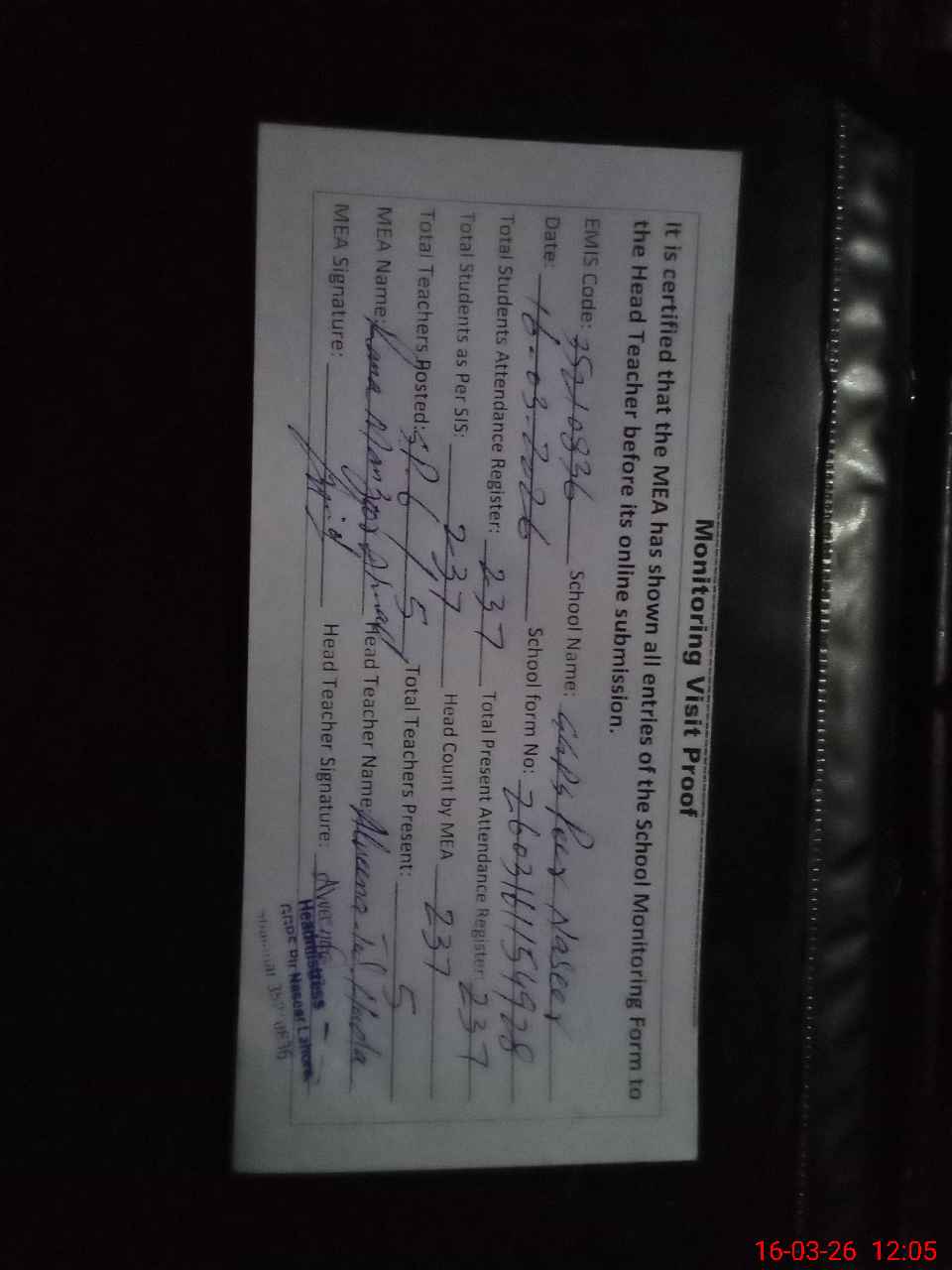 | Attendance Register | Head Teacher | MEA with School | Visit Proof |