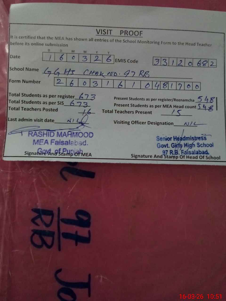 | EMIS Code: 33120682 | Name of School: GGHS CHAK NO 97 RB | |||
