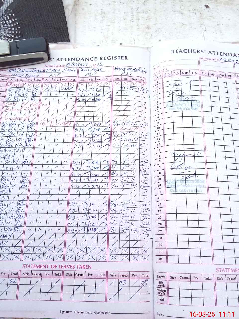 | Remarks (Use Separate Page if Required): Mr. Asif juanid SB on PSER Survey Duty. 2 Rooms are under construction By CM package phase II. | |||||