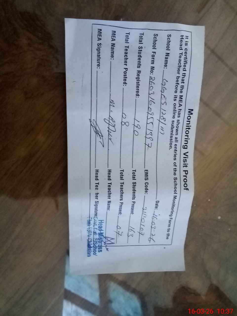 | Attendance Register | Head Teacher | MEA with School | Visit Proof |