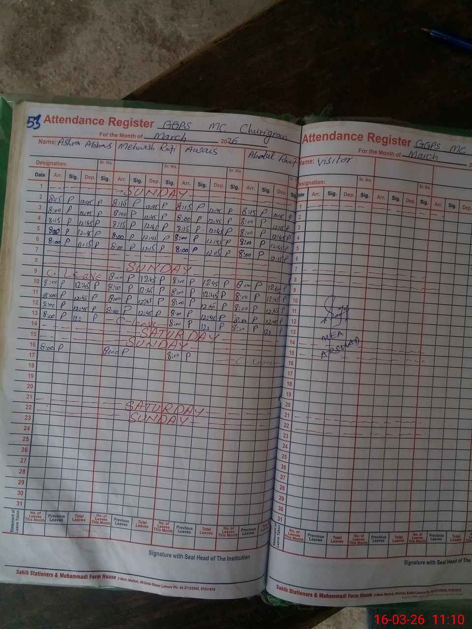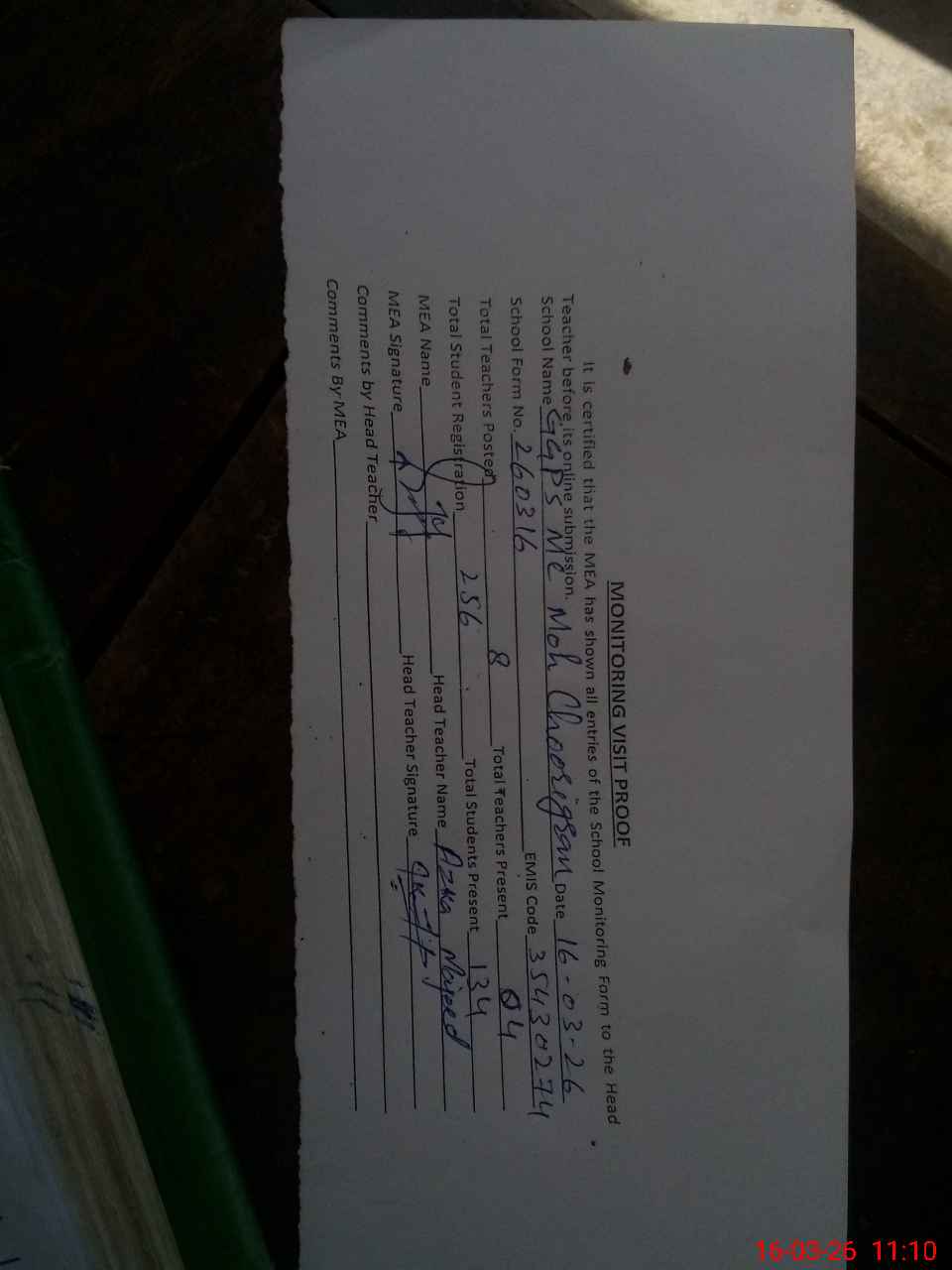 | Attendance Register | Head Teacher | MEA with School | Visit Proof |