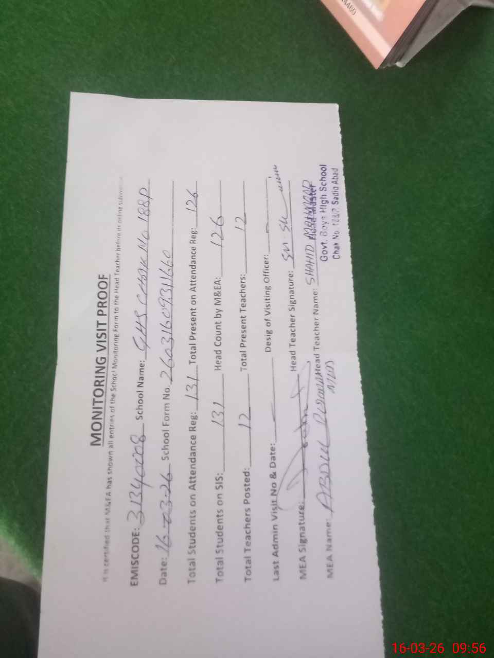| Attendance Register | Head Teacher | MEA with School | Visit Proof |