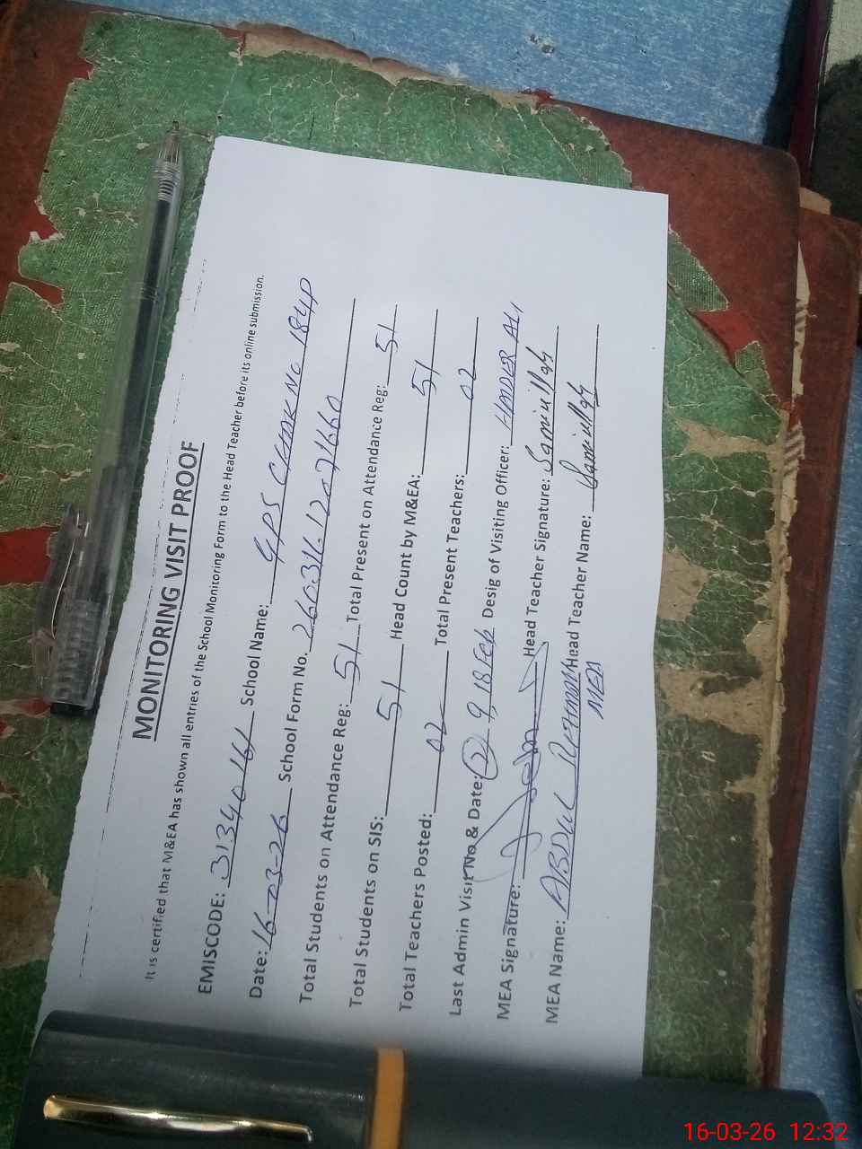 | Attendance Register | Head Teacher | MEA with School | Visit Proof |