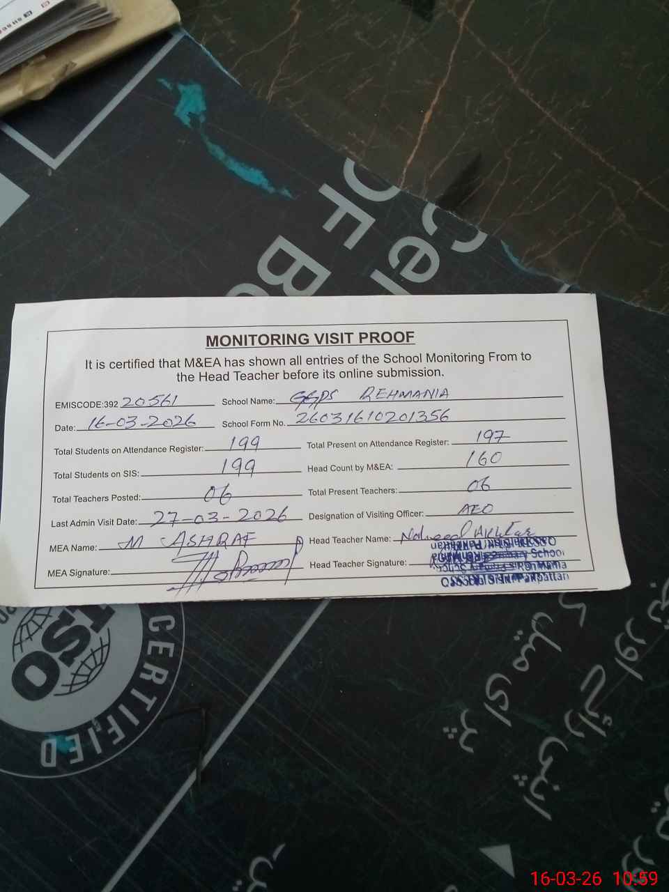| EMIS Code: 39220561 | Name of School: GGPS REHMANIA QABOOLA | |||