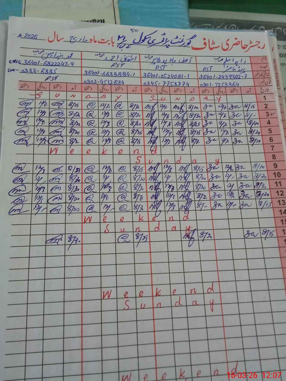 | CNIC | Full Name | Designation | R/C | Absence during last cal. month |