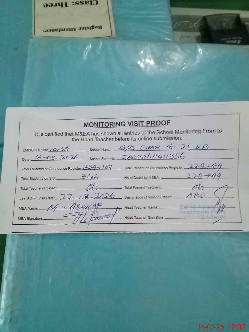 | Attendance Register | Head Teacher | MEA with School | Visit Proof |