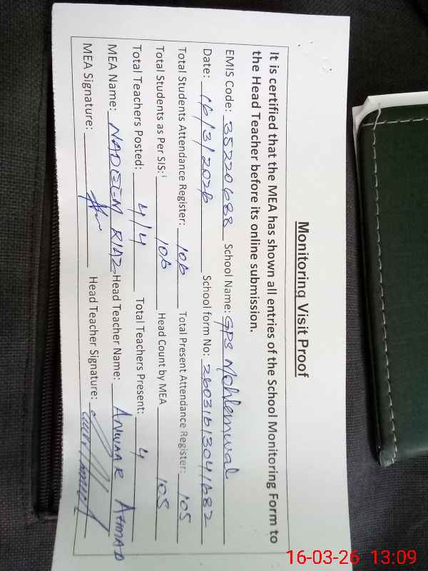 | Attendance Register | Head Teacher | MEA with School | Visit Proof |