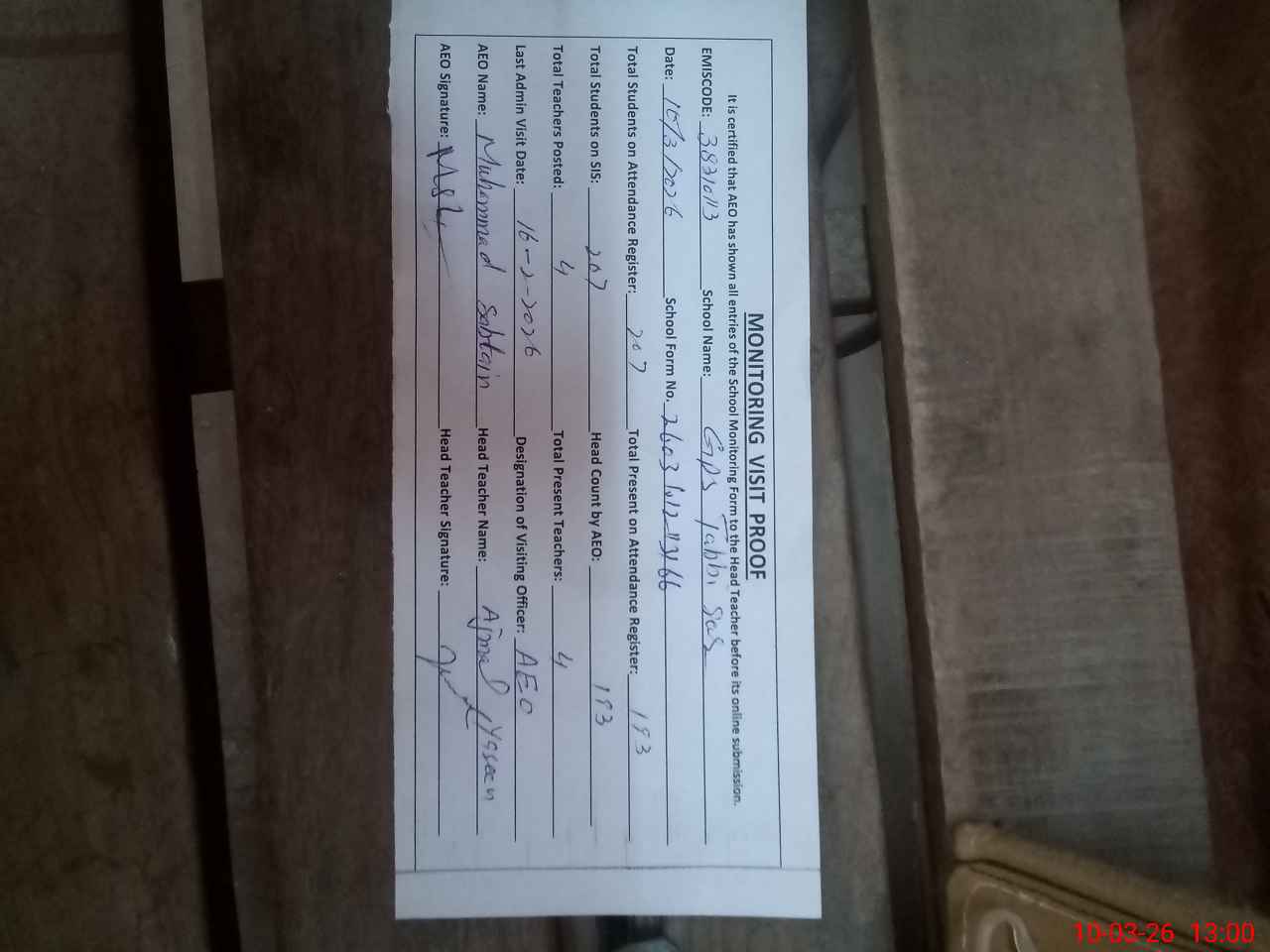 | Attendance Register | Head Teacher | MEA with School | Visit Proof |