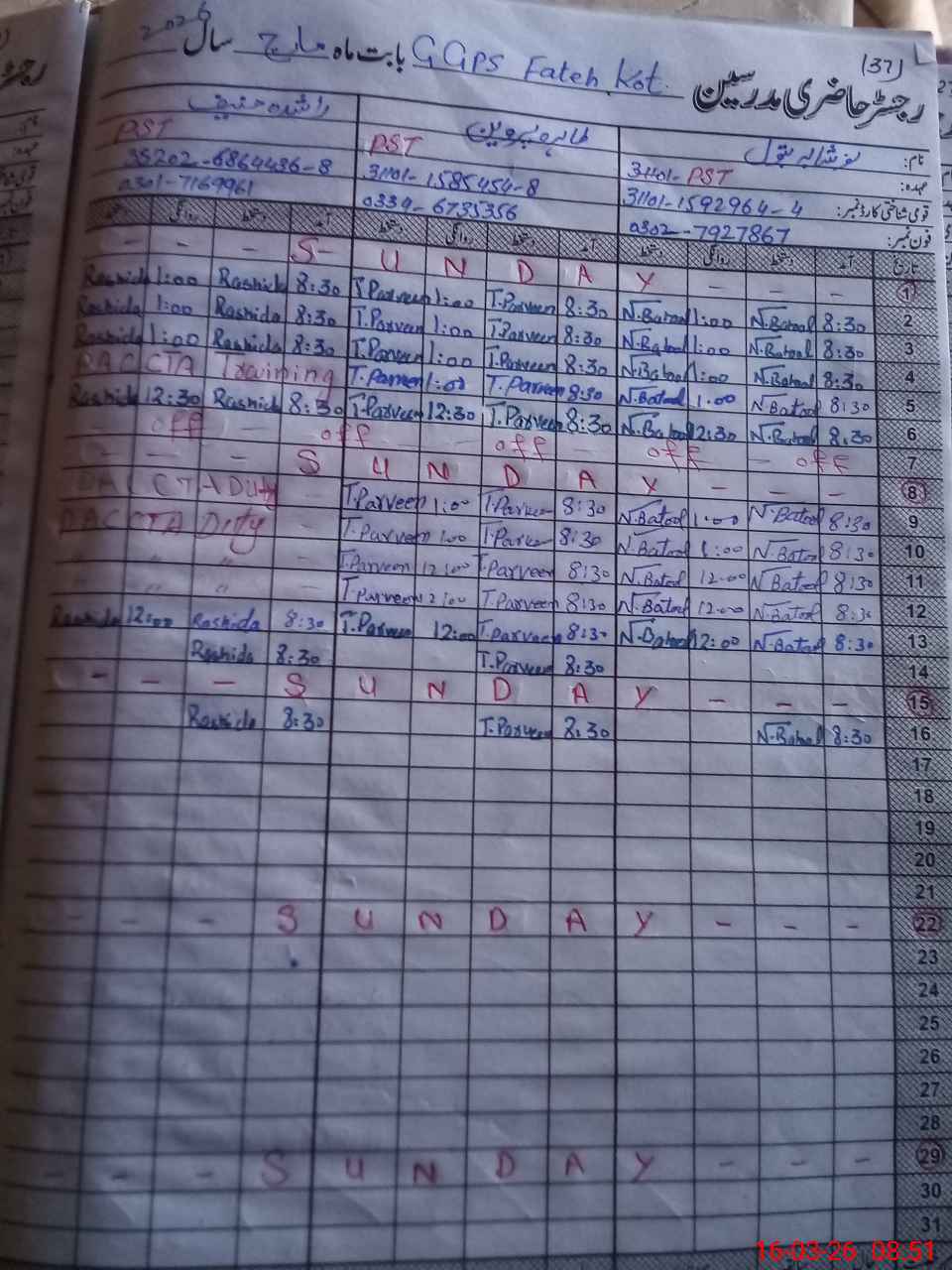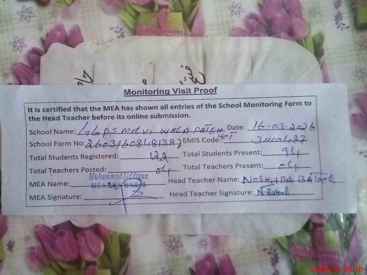 | Name: No**** Ba**** Designation: (School Headmaster's/Headmistress's) PST Phone/Cell Number: 03**** |