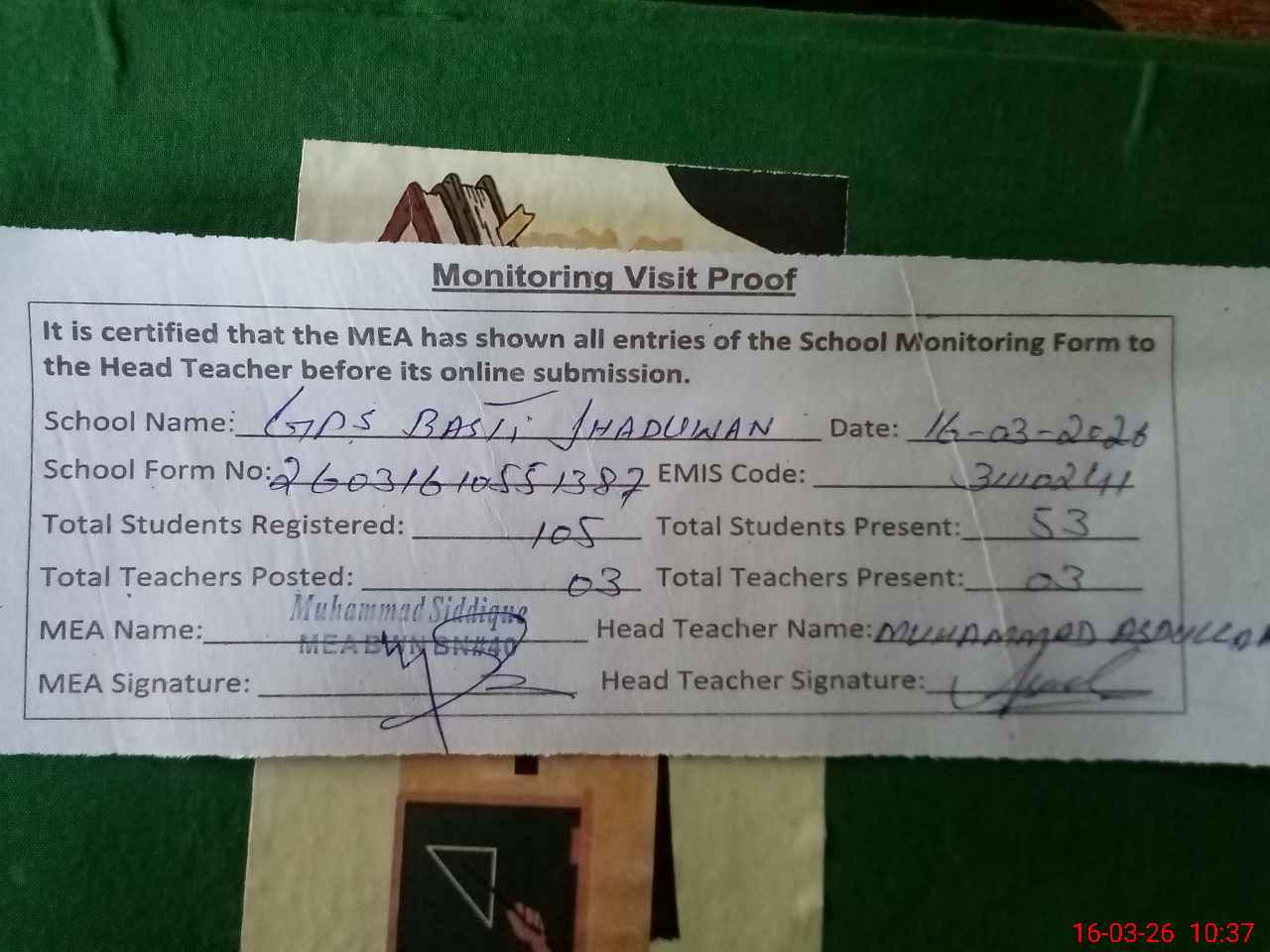 | Certified that this School was Inspected by the Undersigned MEA/DMO Today and the Information Stated Above is as Per Record. | |||||