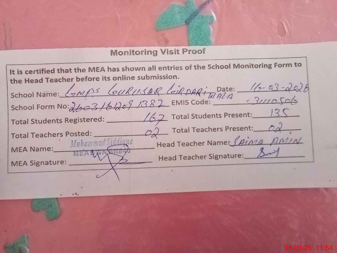 | EMIS Code: 31110506 | Name of School: GMPS GURU SAR GIRDHARI WALA EAST | |||