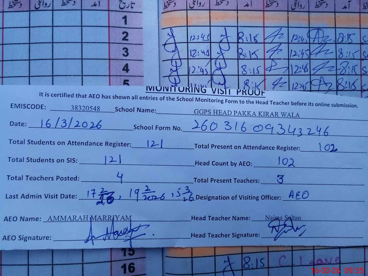 | Attendance Register | Head Teacher | MEA with School | Visit Proof |