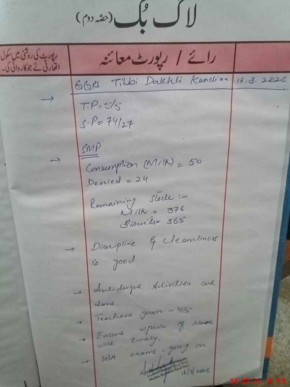 | Certified that this School was Inspected by the Undersigned MEA/DMO Today and the Information Stated Above is as Per Record. | |||||