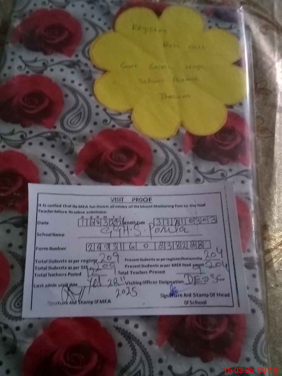 | Attendance Register | Head Teacher | MEA with School | Visit Proof |