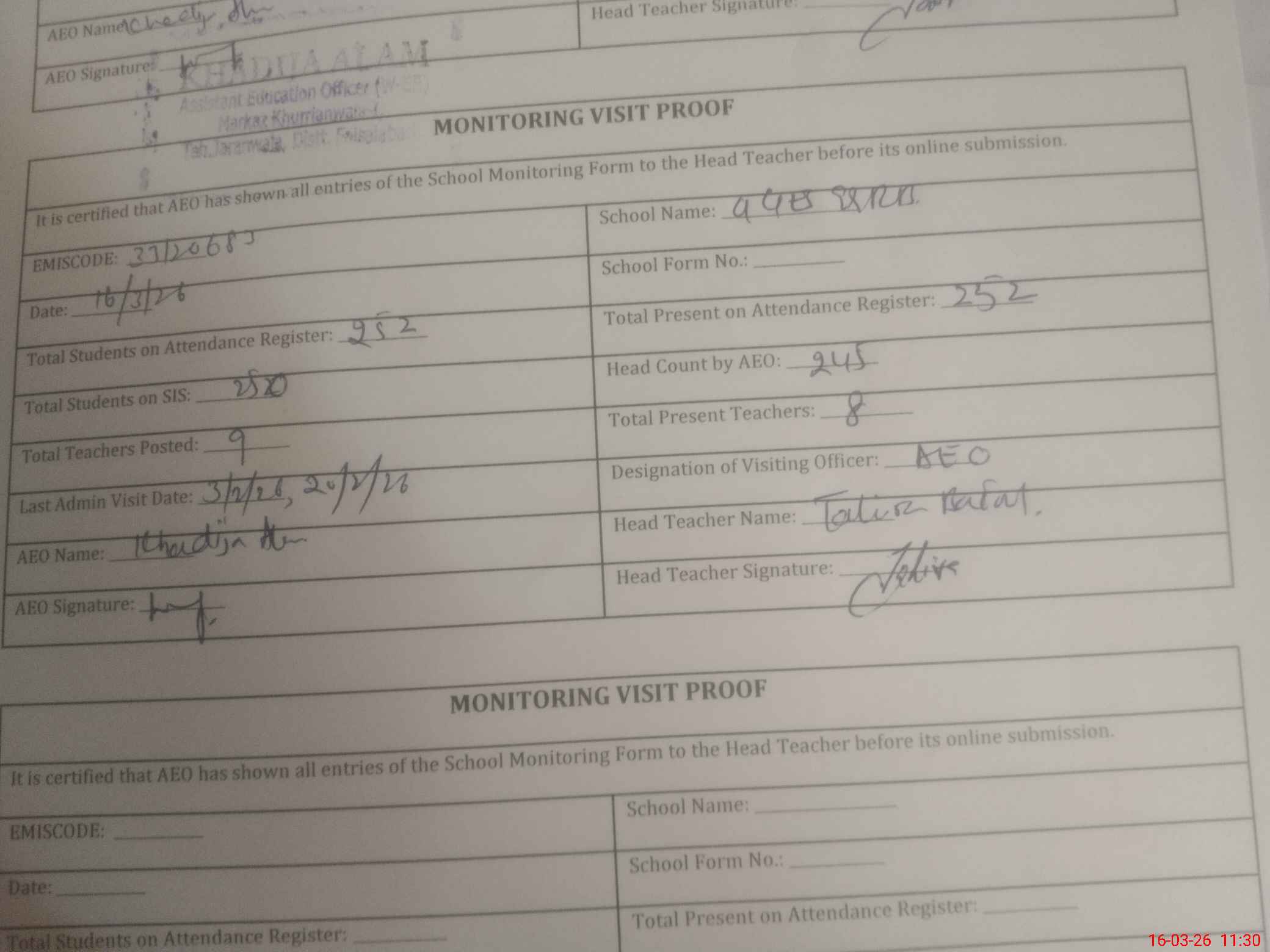 | Attendance Register | Head Teacher | MEA with School | Visit Proof |