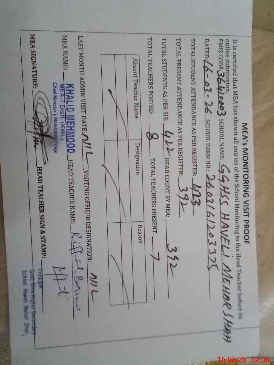 | EMIS Code: 36410003 | Name of School: GGHSS HAVELI MEHR SHAH, ABDUL HAKIM | |||