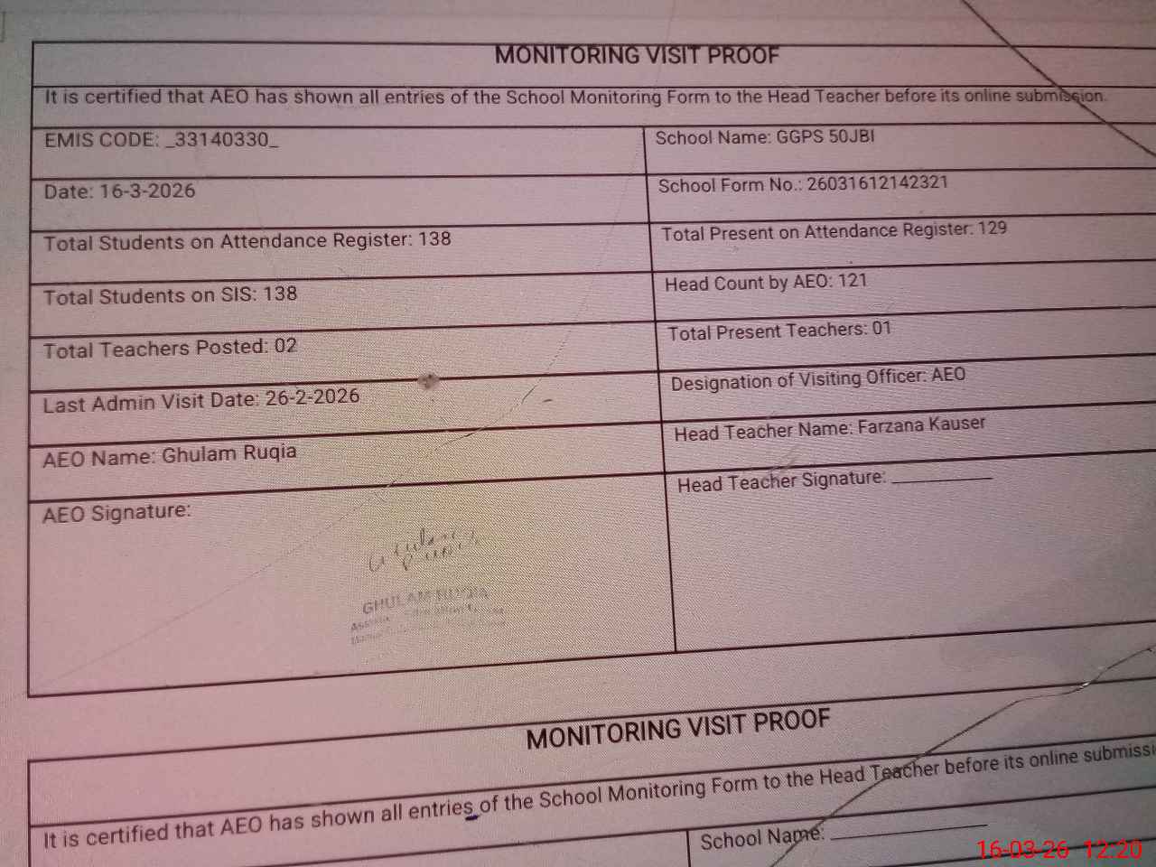 | Attendance Register | Head Teacher | MEA with School | Visit Proof |