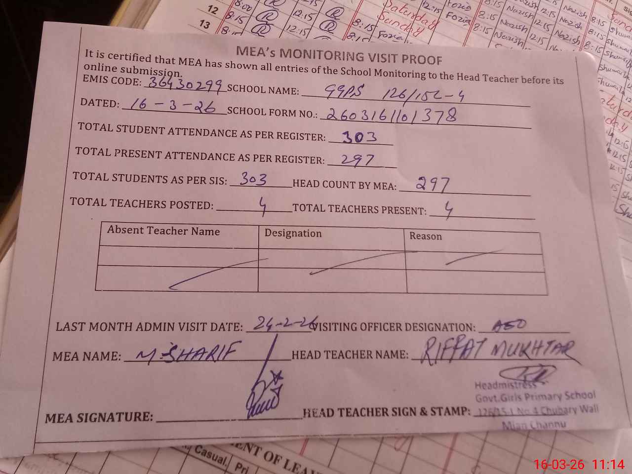 | Attendance Register | Head Teacher | MEA with School | Visit Proof |