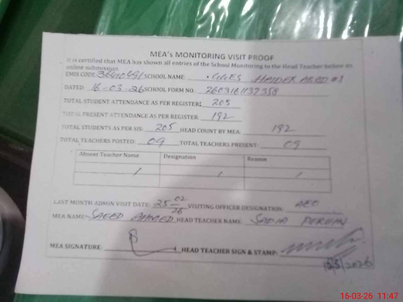 | Attendance Register | Head Teacher | MEA with School | Visit Proof |