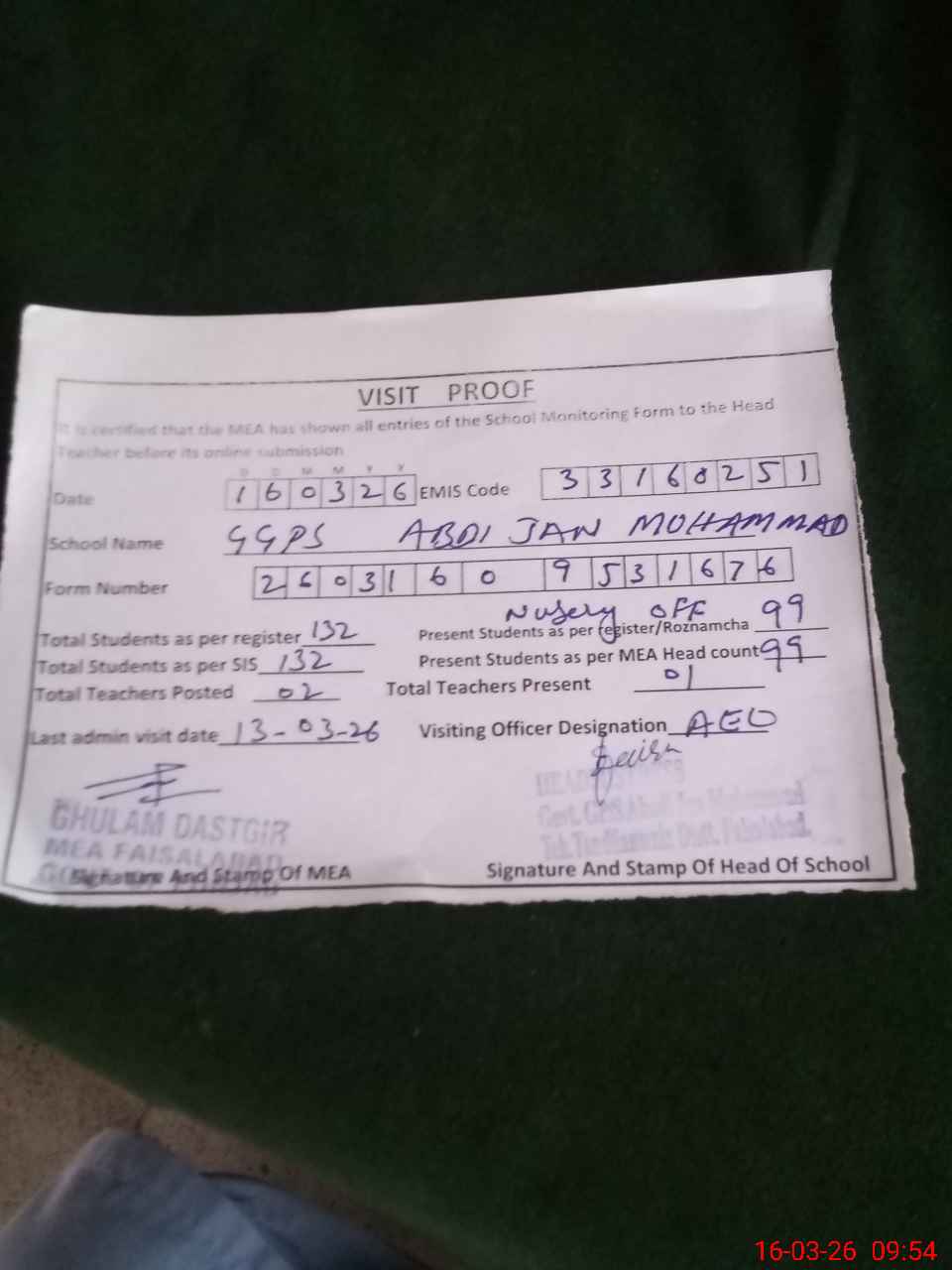| Attendance Register | Head Teacher | MEA with School | Visit Proof |