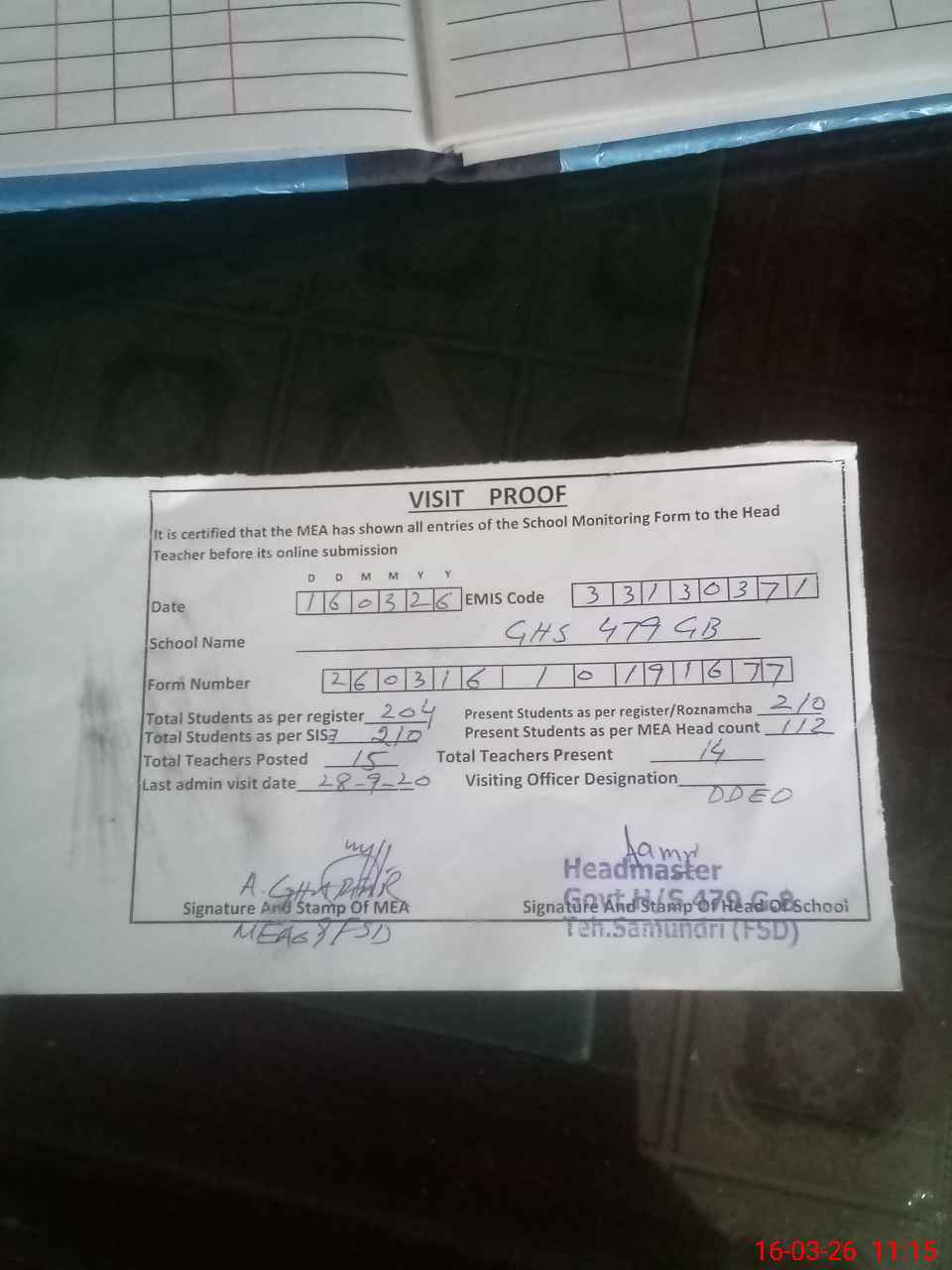 | Attendance Register | Head Teacher | MEA with School | Visit Proof |