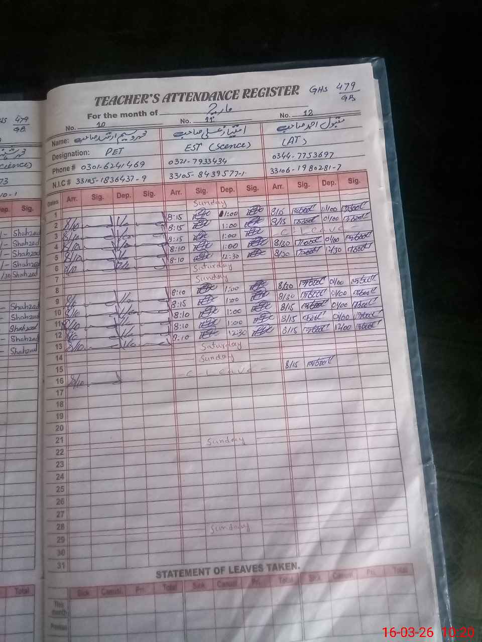 | CNIC | Full Name | Designation | R/C | Absence During Last Calender Month |