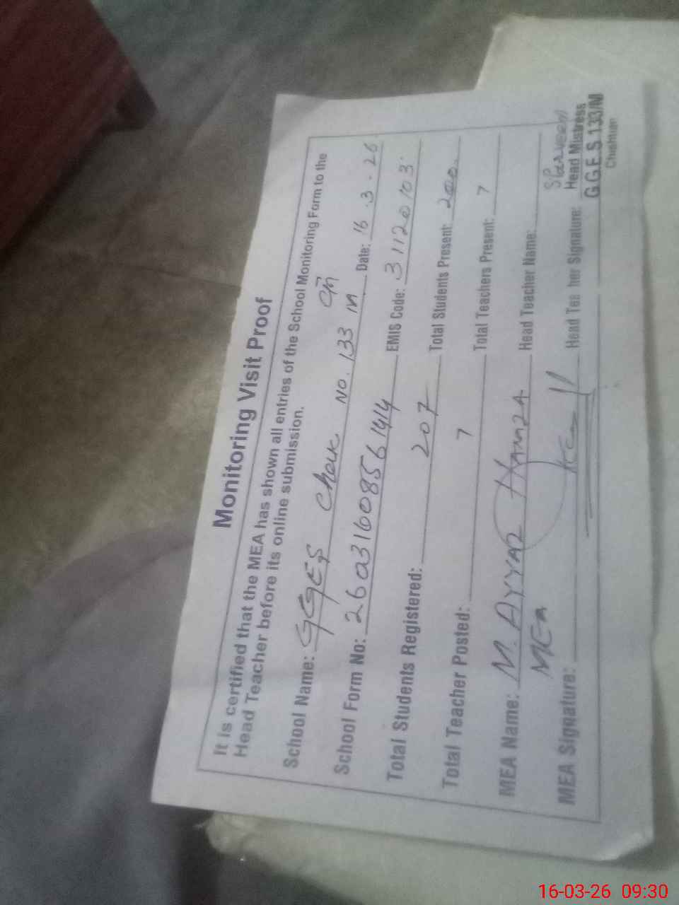 | Attendance Register | Head Teacher | MEA with School | Visit Proof |