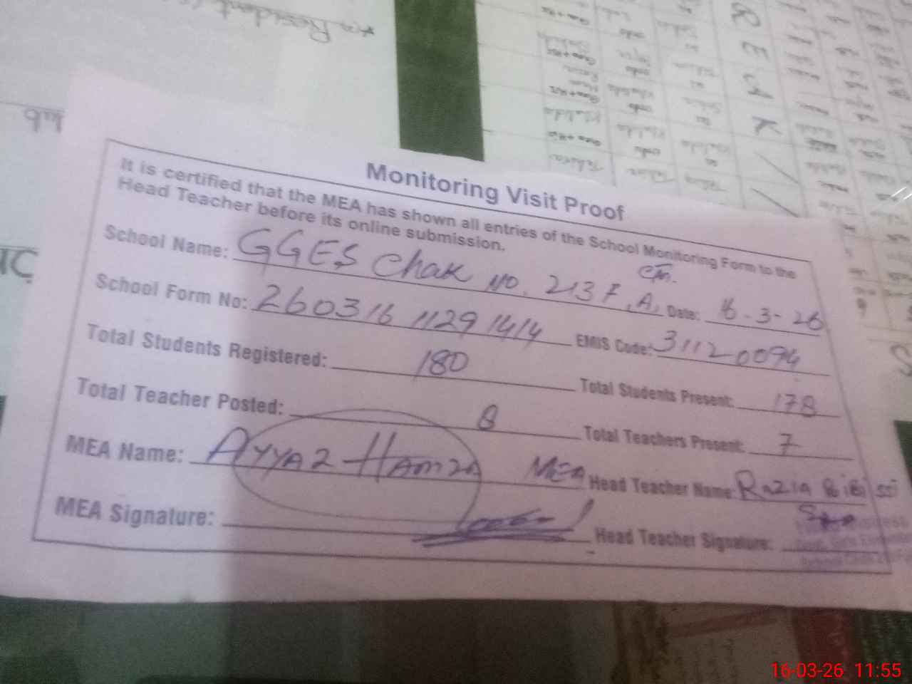| Attendance Register | Head Teacher | MEA with School | Visit Proof |