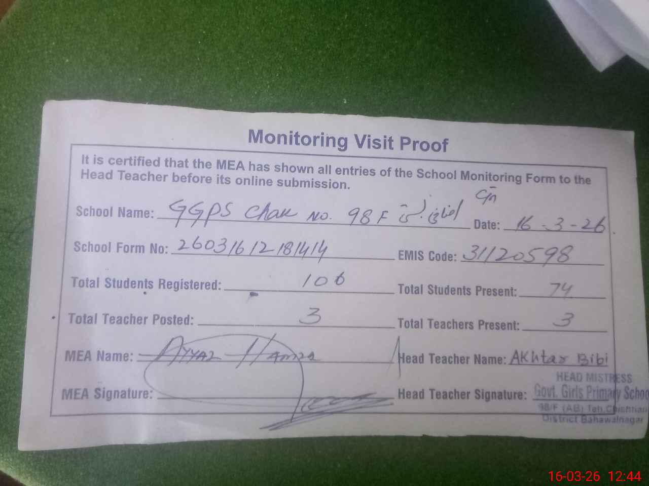 | Attendance Register | Head Teacher | MEA with School | Visit Proof |