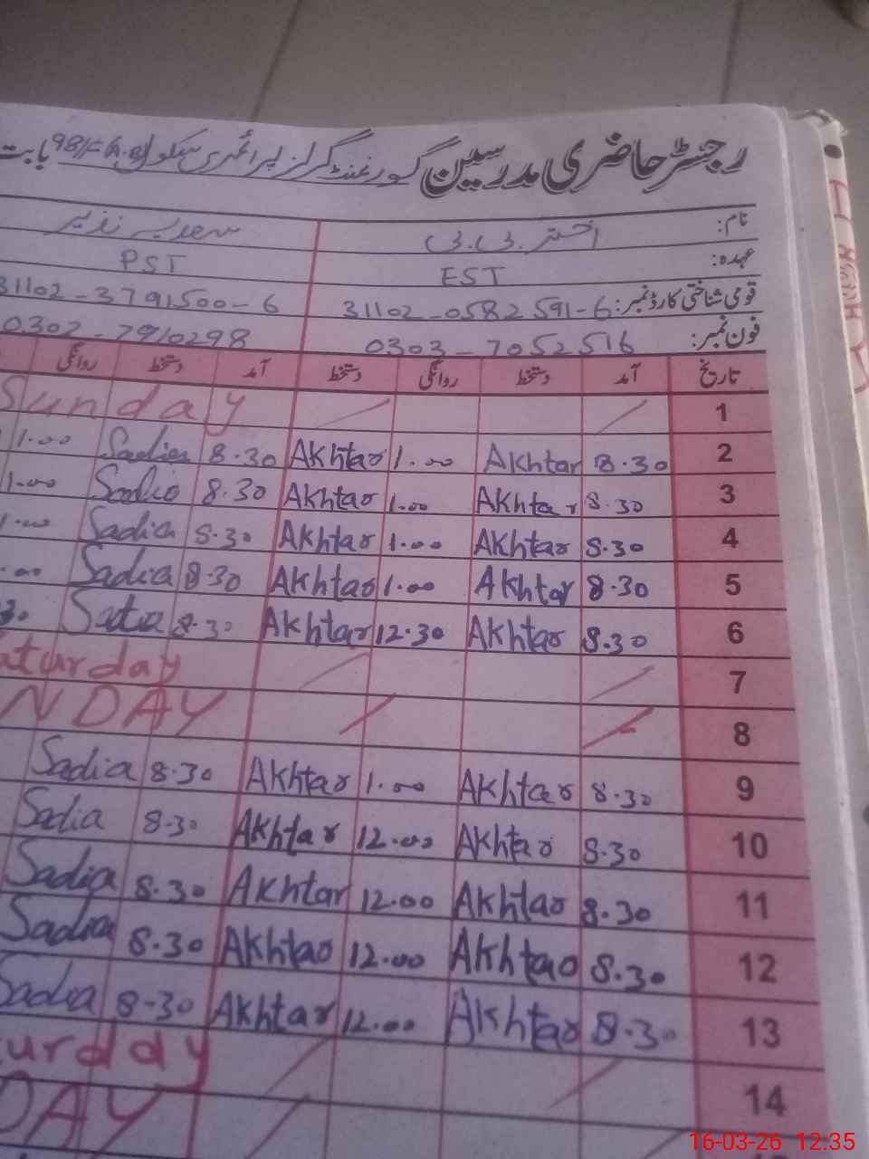 | Name: AK**** BI**** Designation: (School Headmaster's/Headmistress's) EST Phone/Cell Number: 03**** |