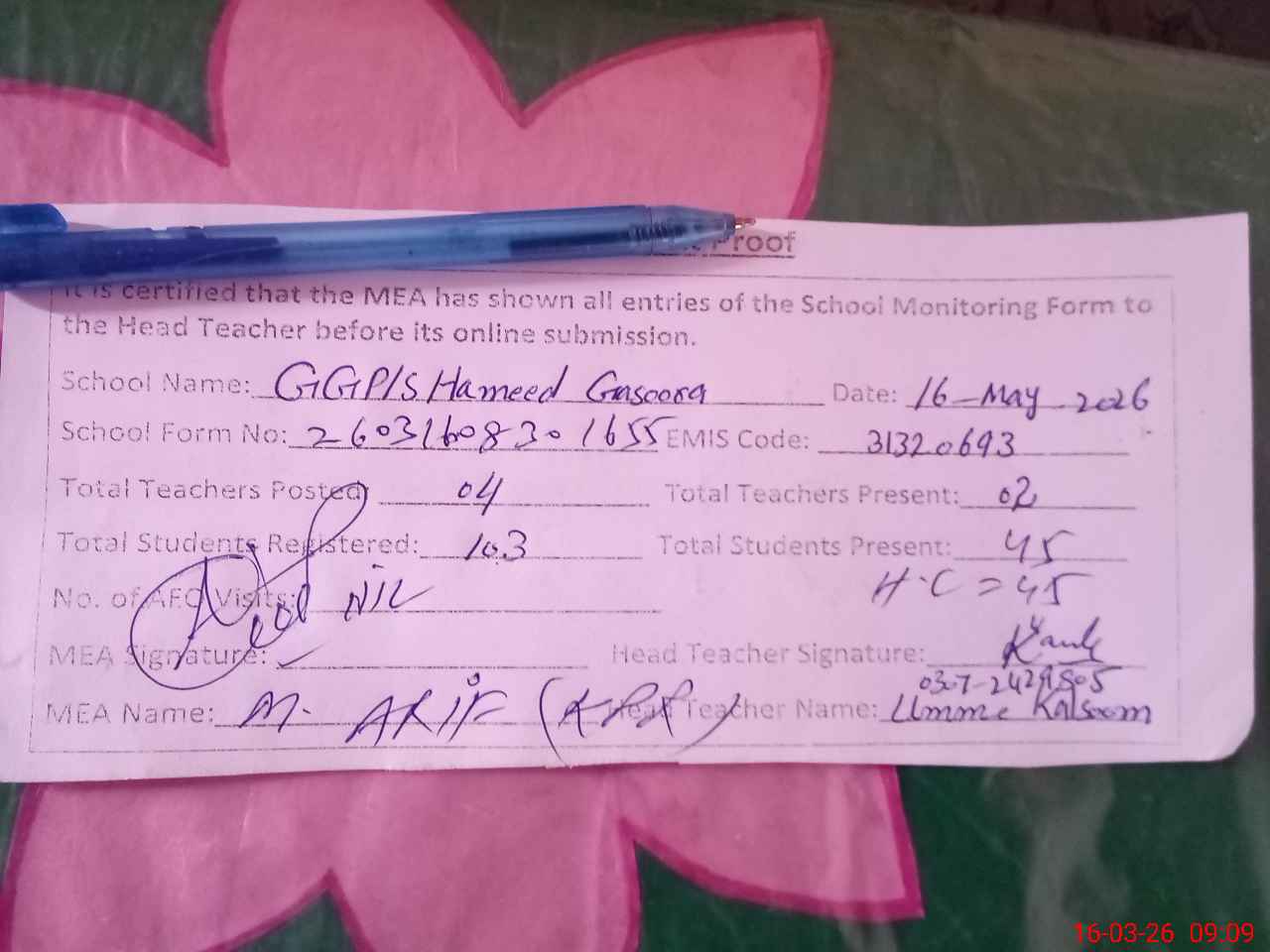 | Attendance Register | Head Teacher | MEA with School | Visit Proof |