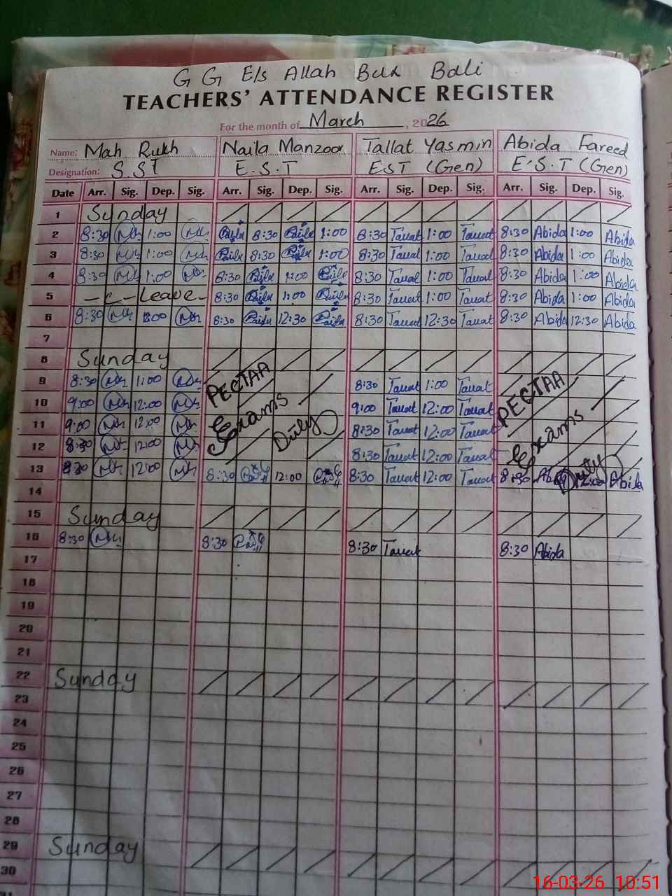| Leave | Duty | Absent | Maternity | Medical | Ex- Pak |