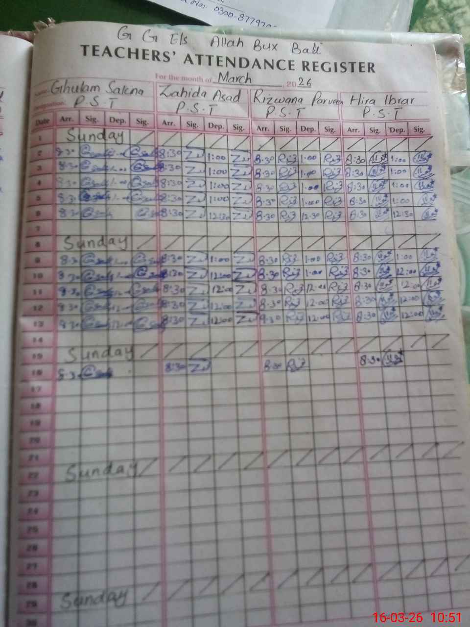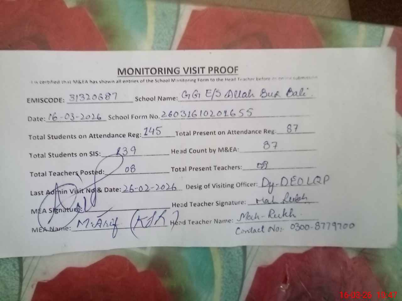 | Name: MA**** RU**** Designation: (School Headmaster's/Headmistress's) S.S.T.(G) Phone/Cell Number: 03**** |