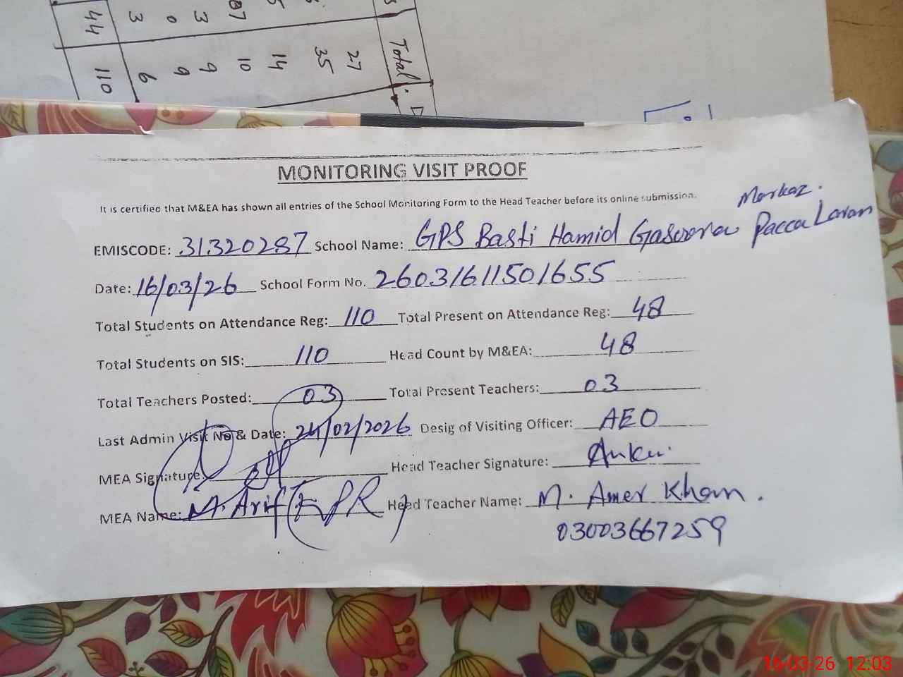 | EMIS Code: 31320287 | Name of School: GPS BASTI HAMID GASOORA | |||