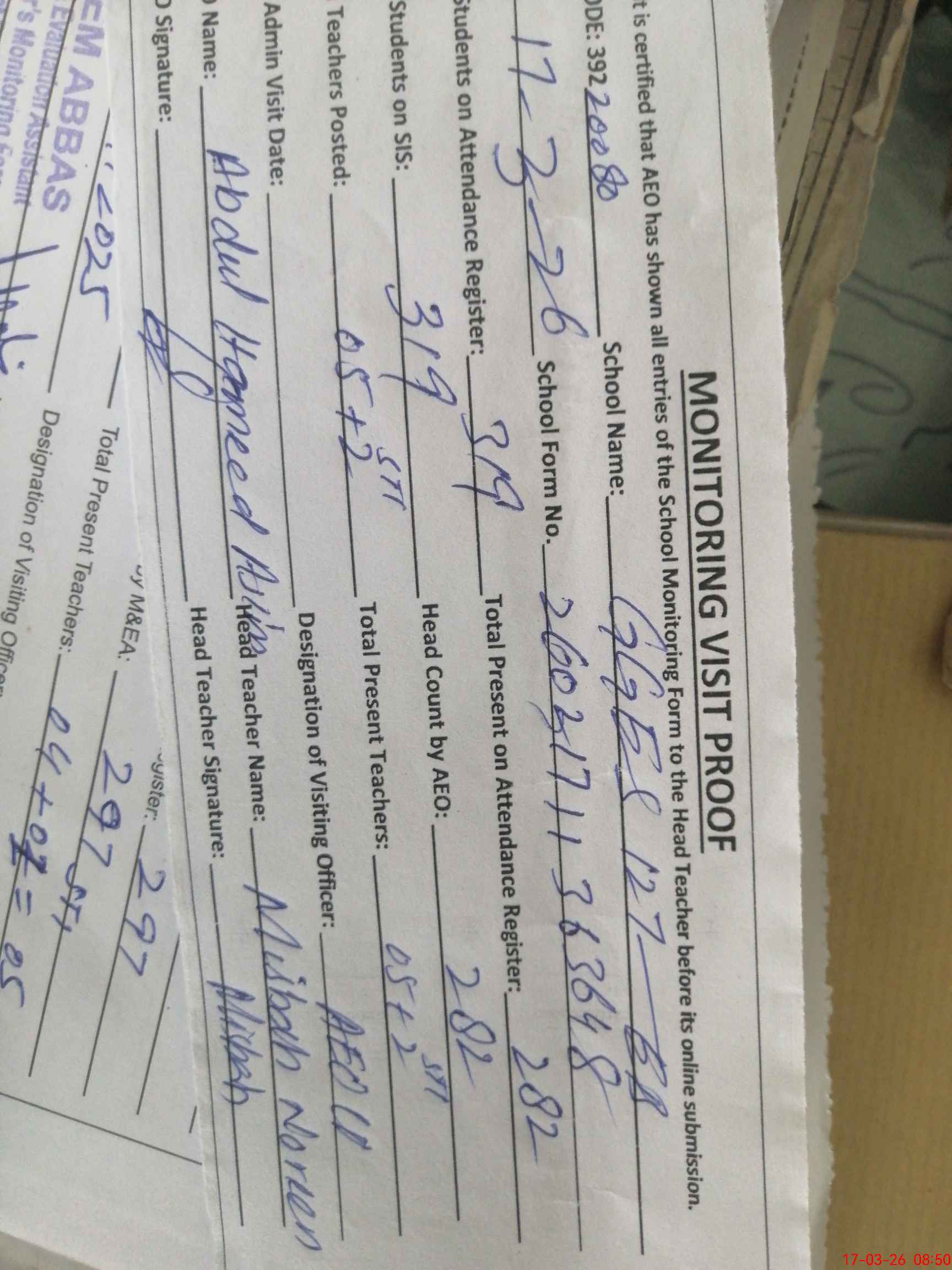 | Attendance Register | Head Teacher | MEA with School | Visit Proof |