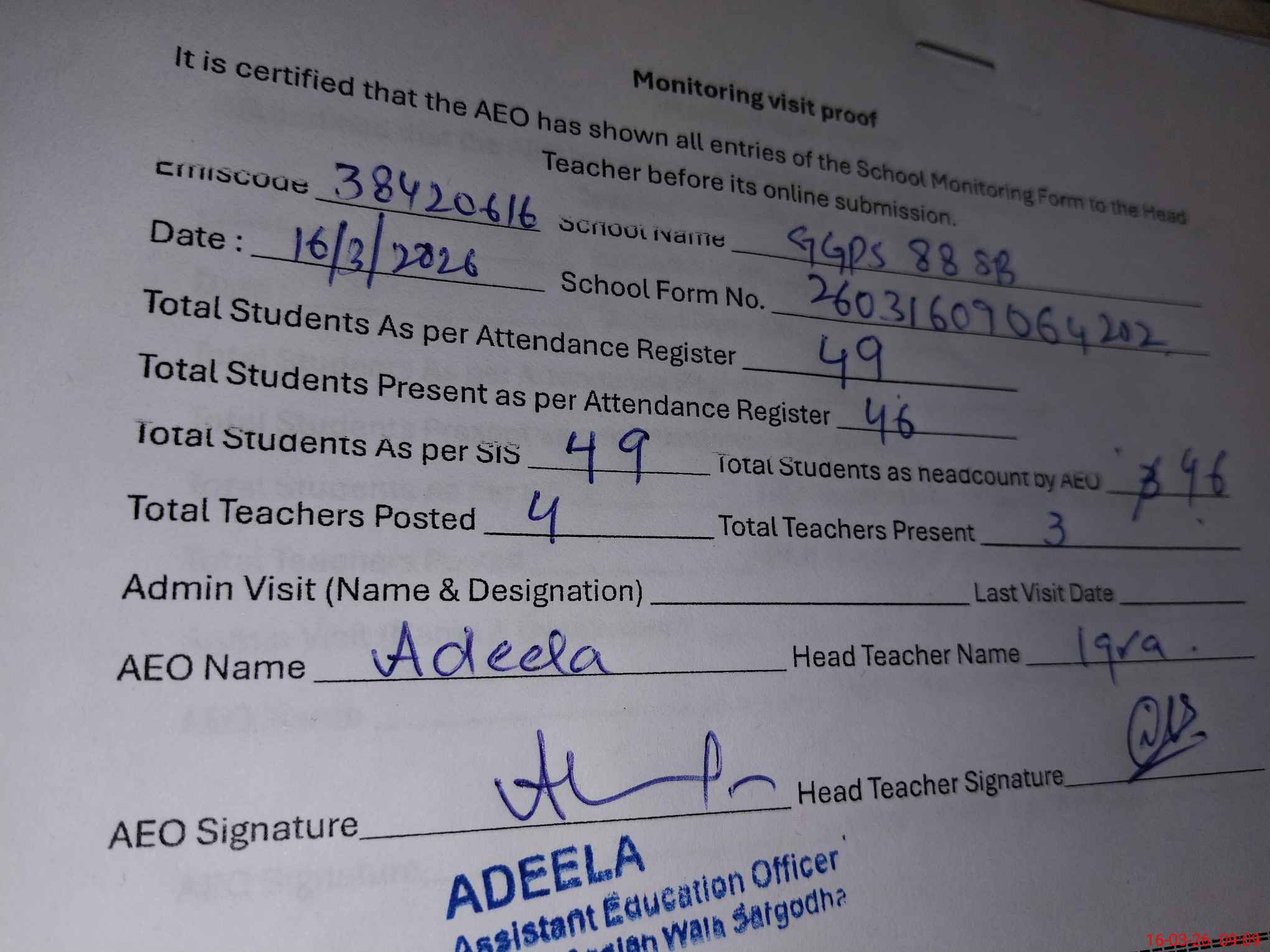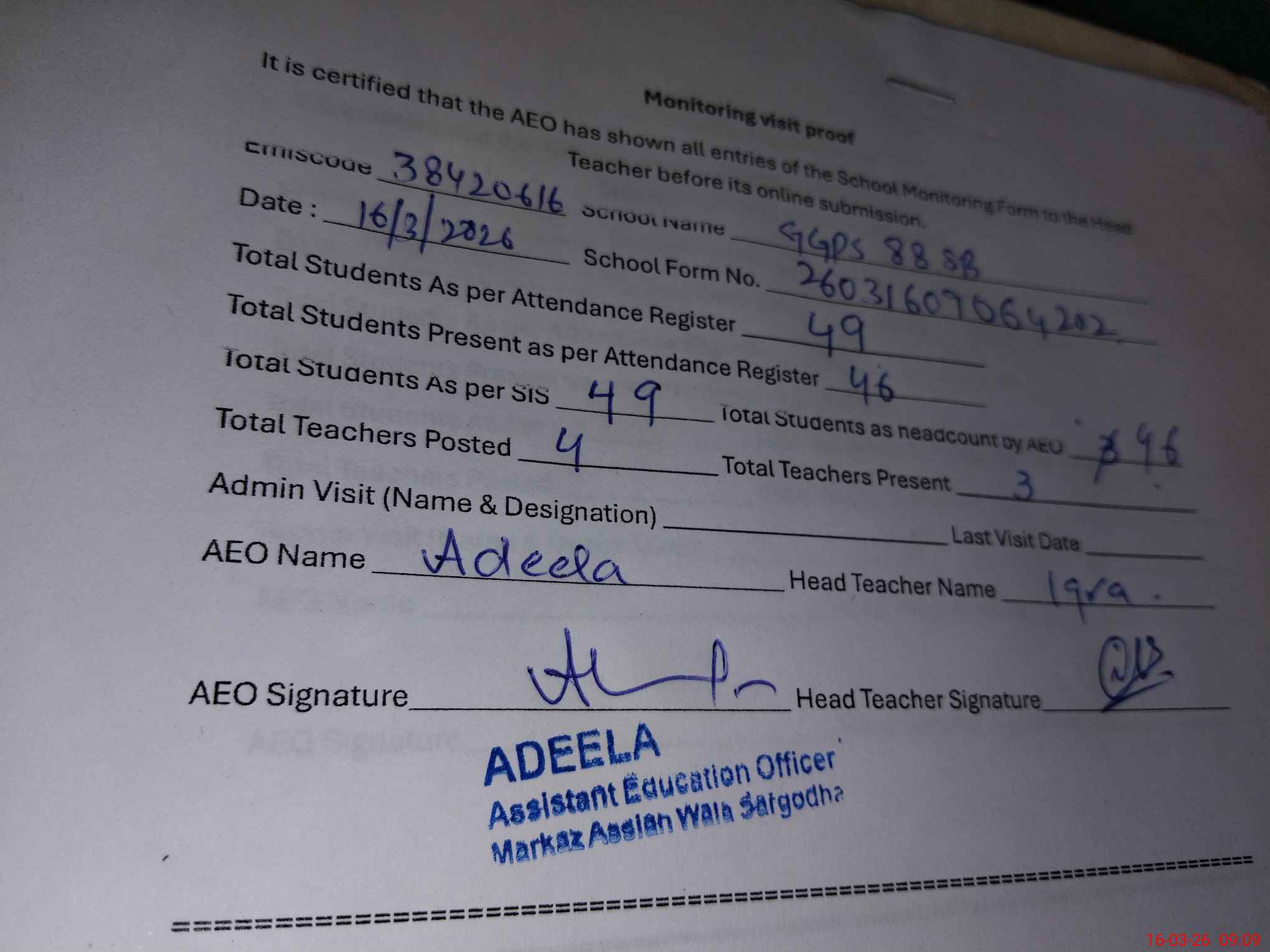 | Attendance Register | Head Teacher | MEA with School | Visit Proof |