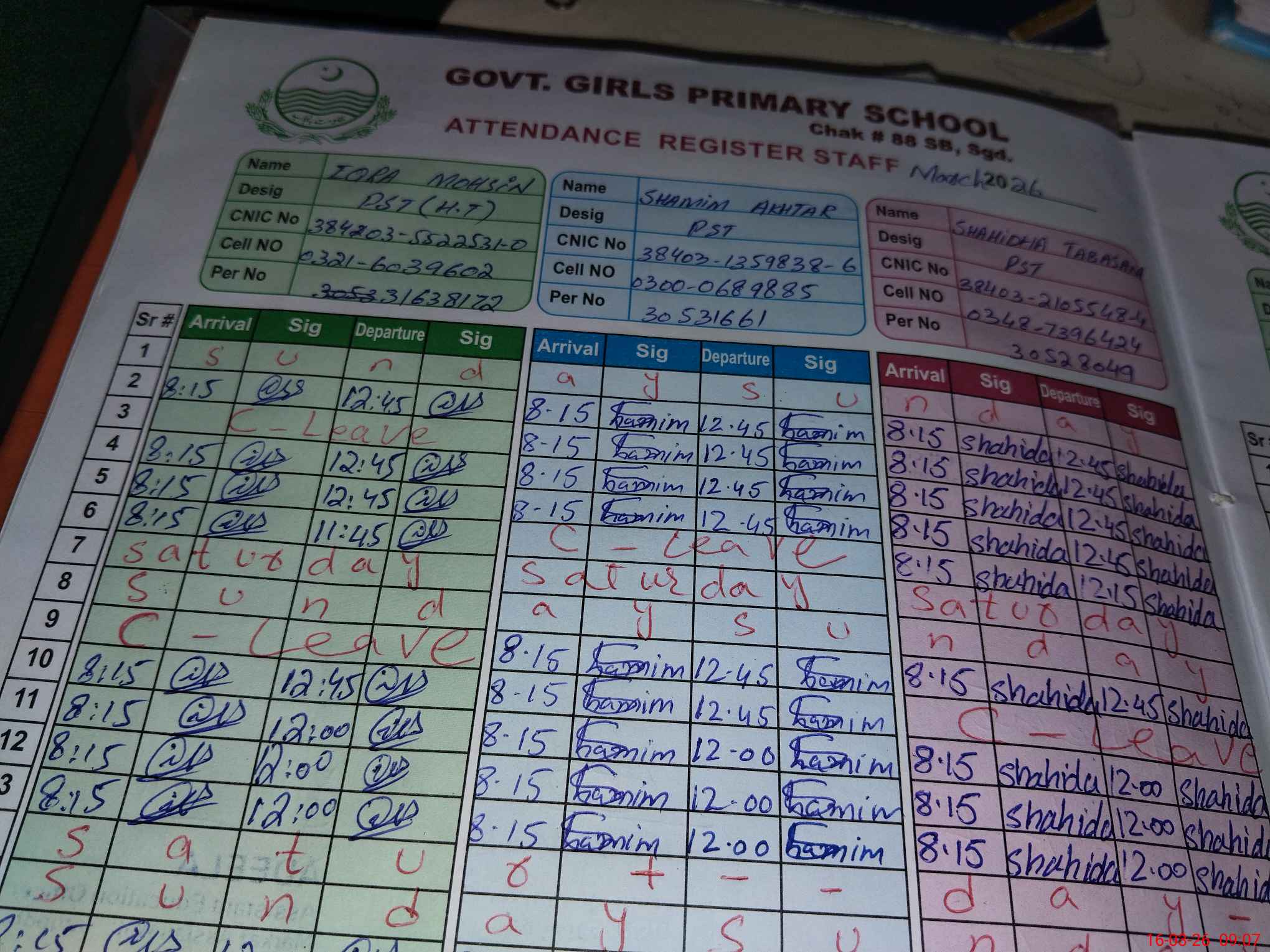 | CNIC | Full Name | Designation | R/C | Absence During Last Calender Month |