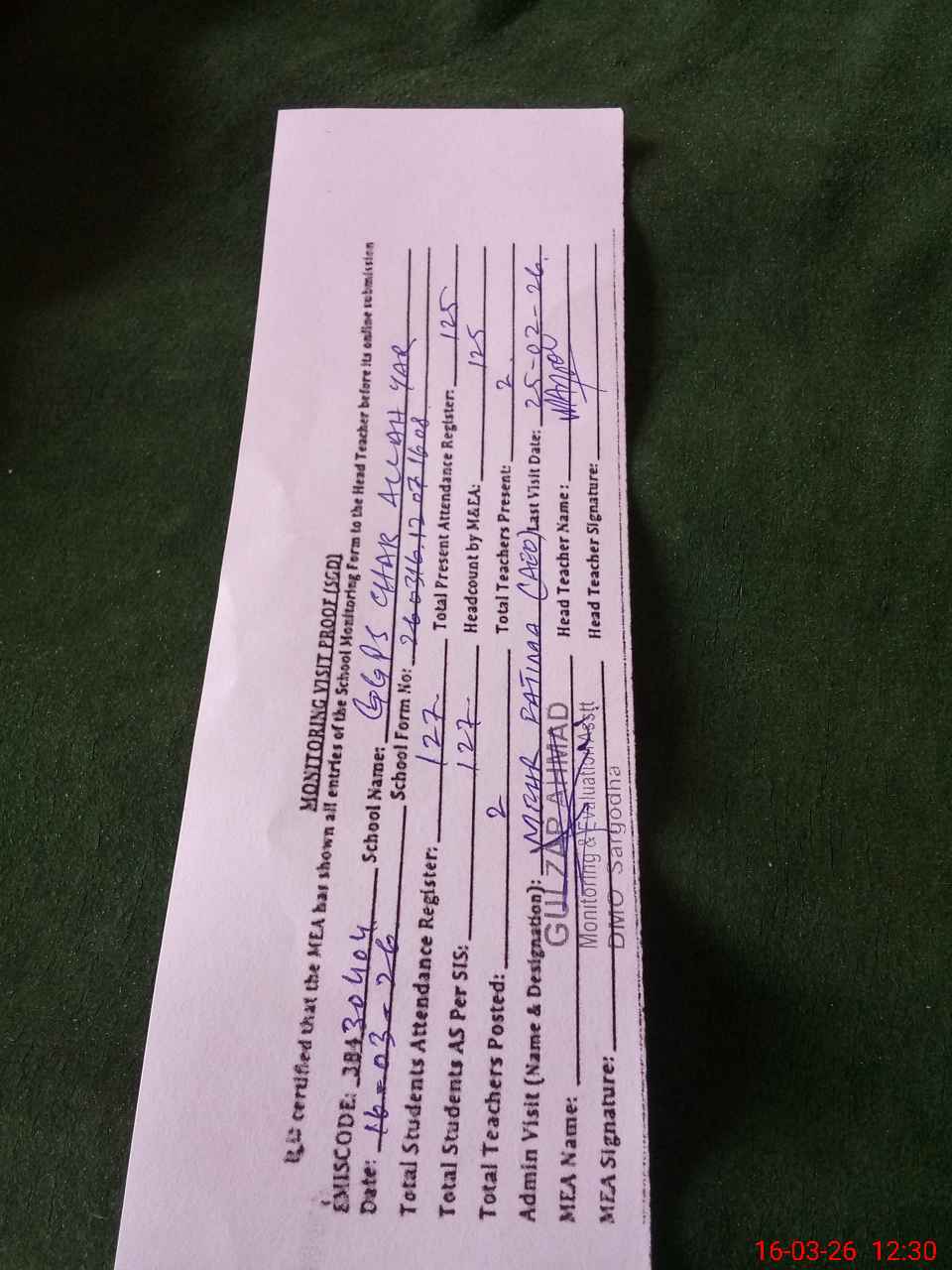 | Attendance Register | Head Teacher | MEA with School | Visit Proof |