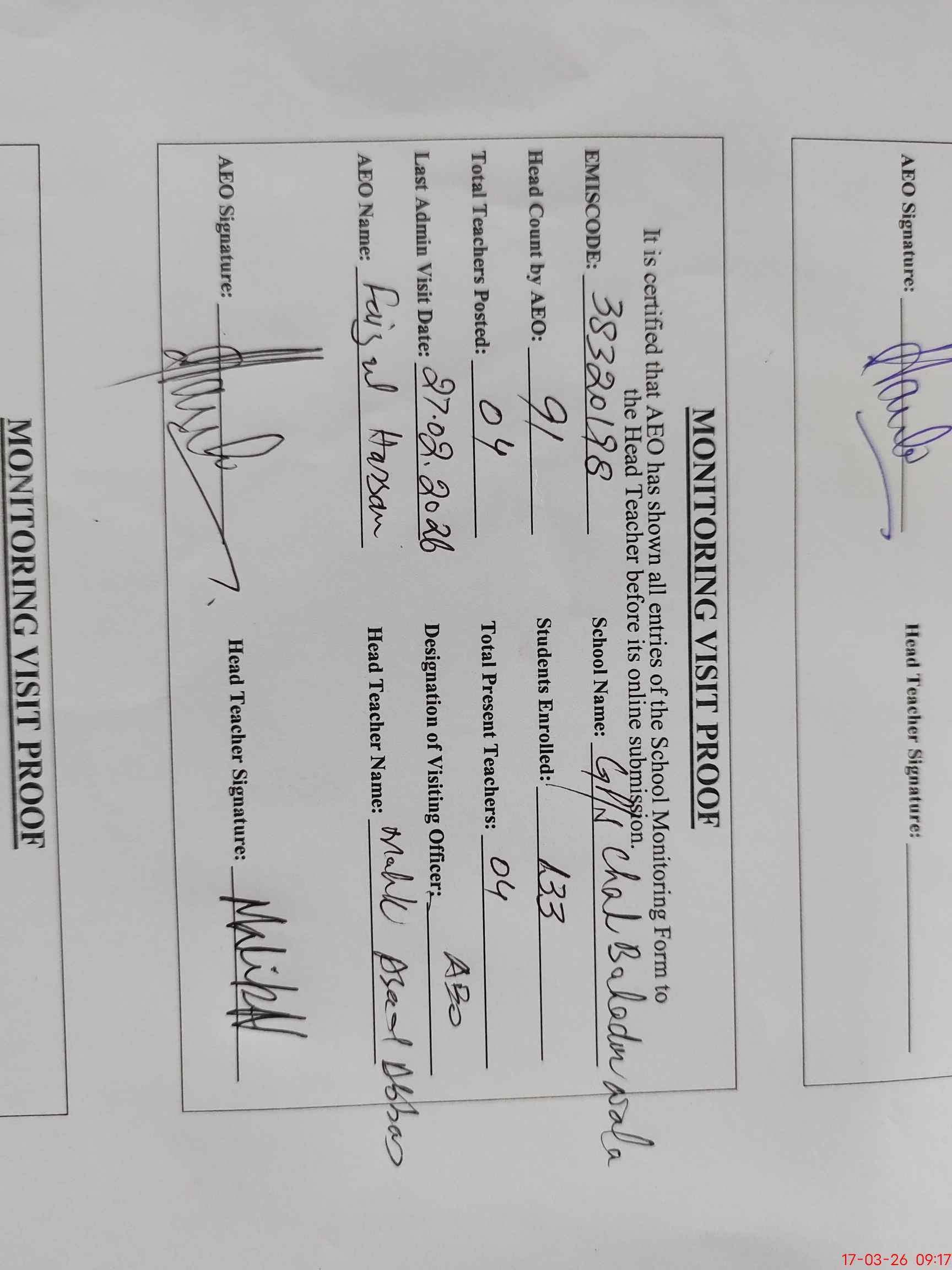 | Attendance Register | Head Teacher | MEA with School | Visit Proof |