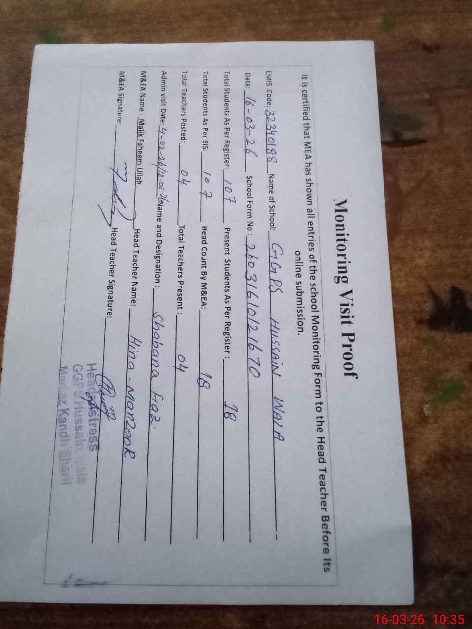 | EMIS Code: 32340188 | Name of School: GGPS HUSSAIN WALA | |||