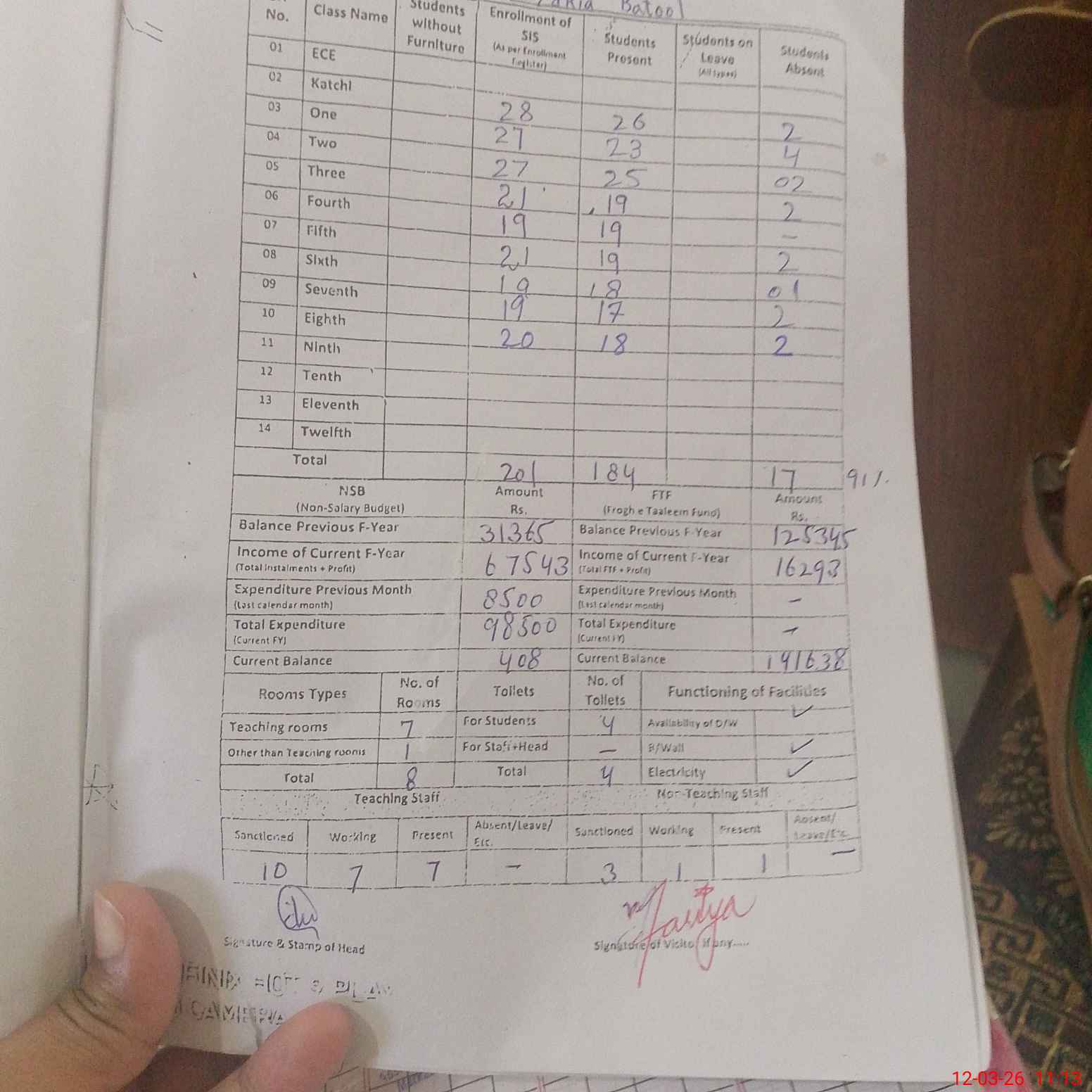 | Total no. of Classrooms: 8 No. of Classrooms Used for Teaching: 7 No. of Classrooms Storing Old Furniture, FTBs, etc: 0Comments if Any: 0 |