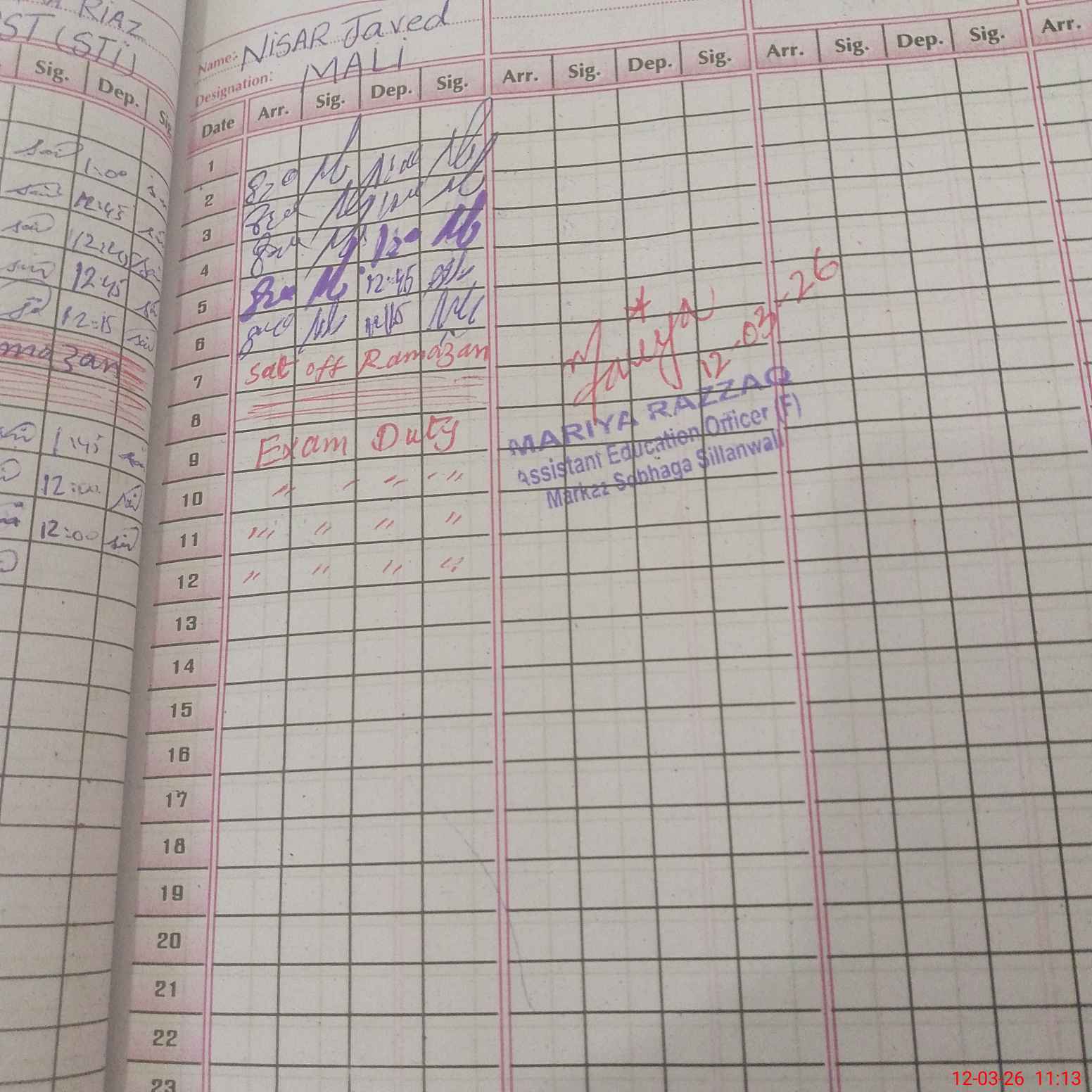 | CNIC | Full Name | Designation | R/C | Absence During Last Calender Month |