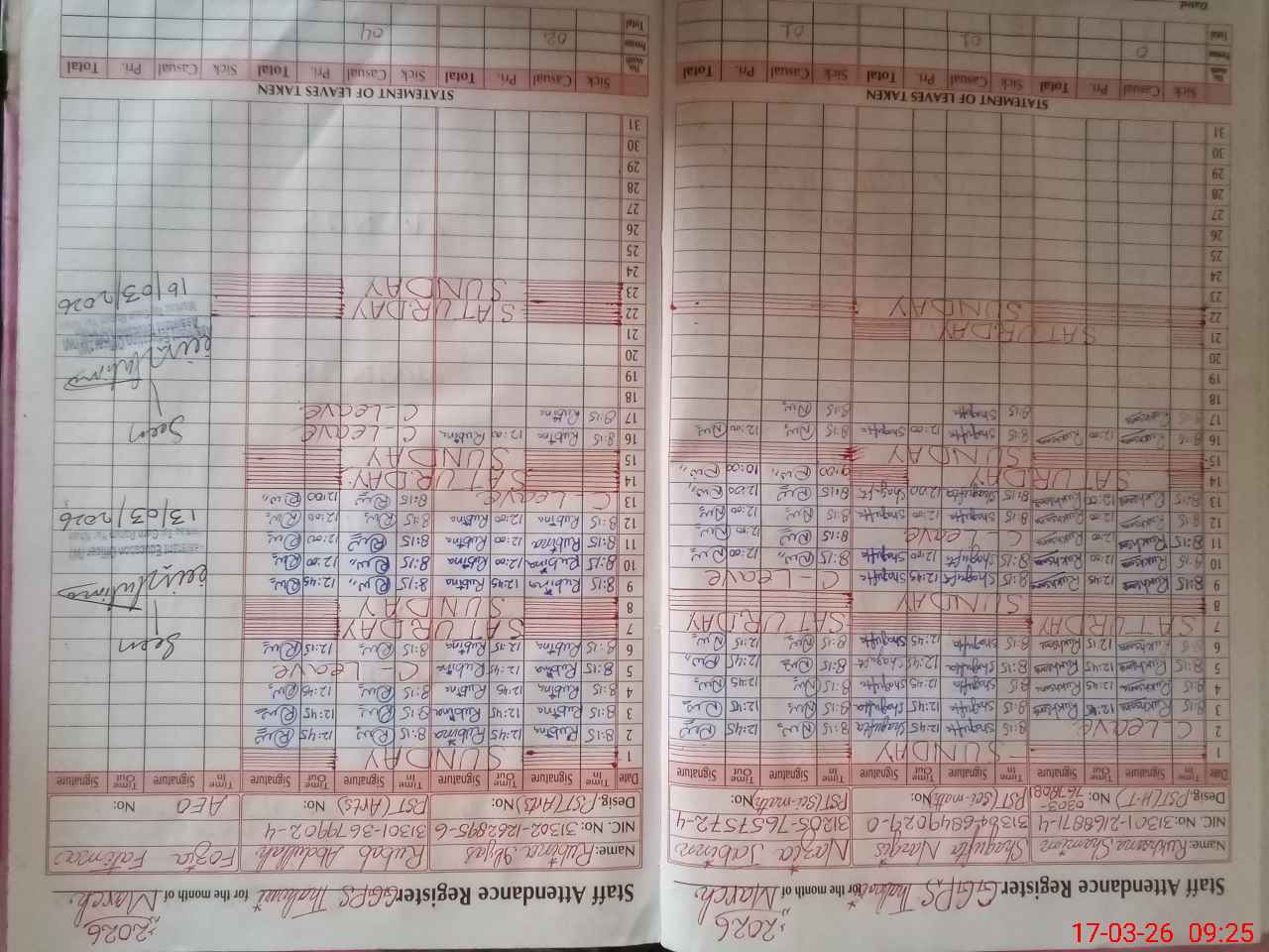 | CNIC | Full Name | Designation | R/C | Absence During Last Calender Month |