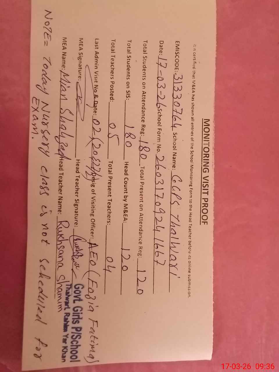 | Attendance Register | Head Teacher | MEA with School | Visit Proof |