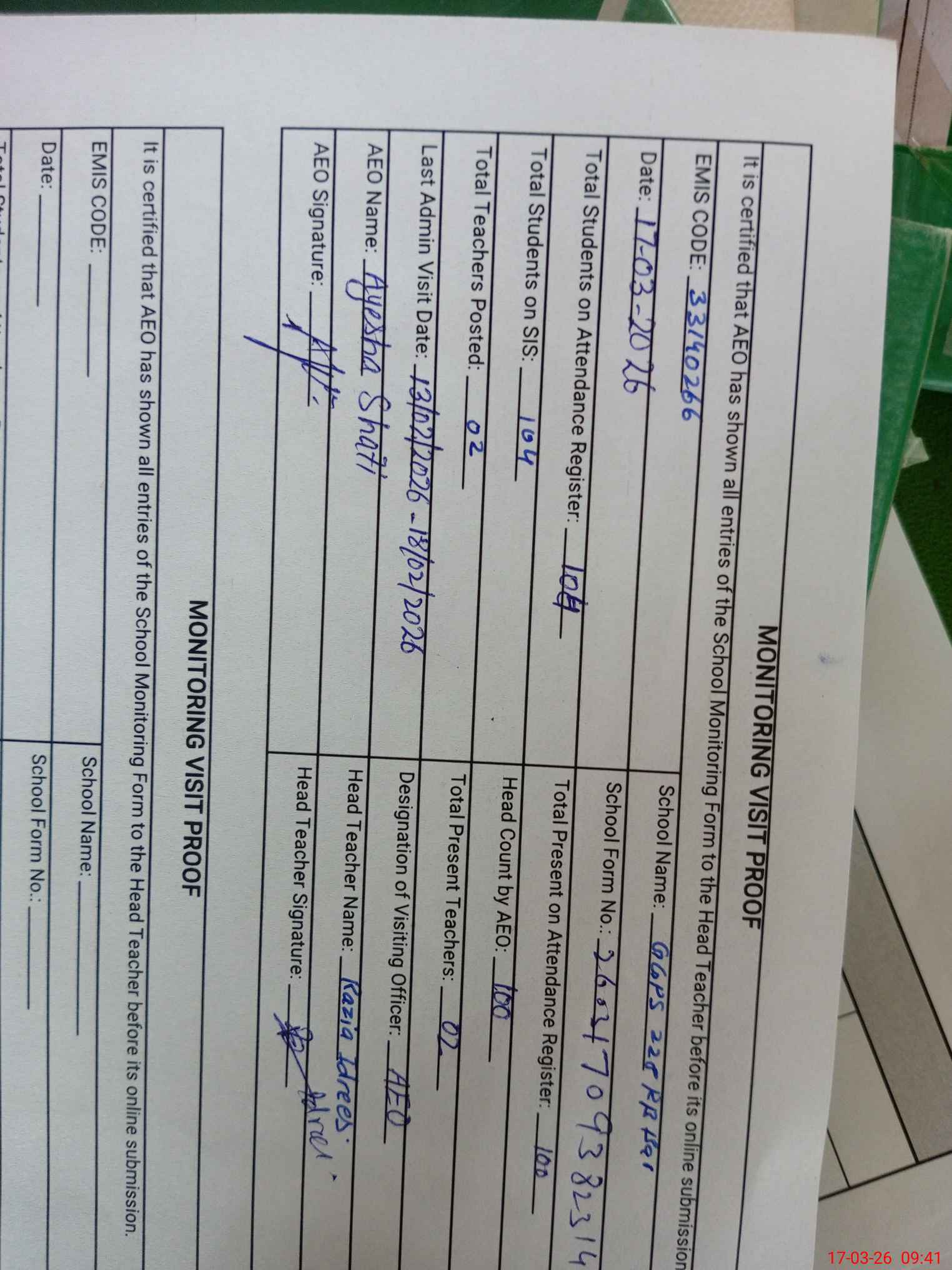 | EMIS Code: 33140266 | Name of School: GGPS CHAK NO. 228 RB BAR | |||