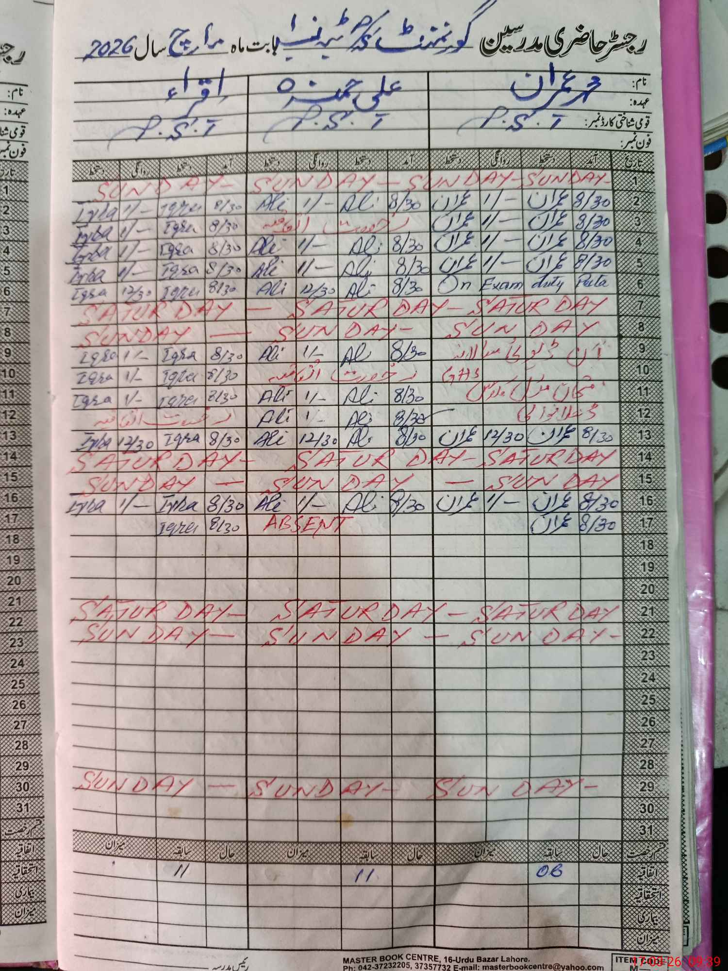 | CNIC | Full Name | Designation | R/C | Absence During Last Calender Month |