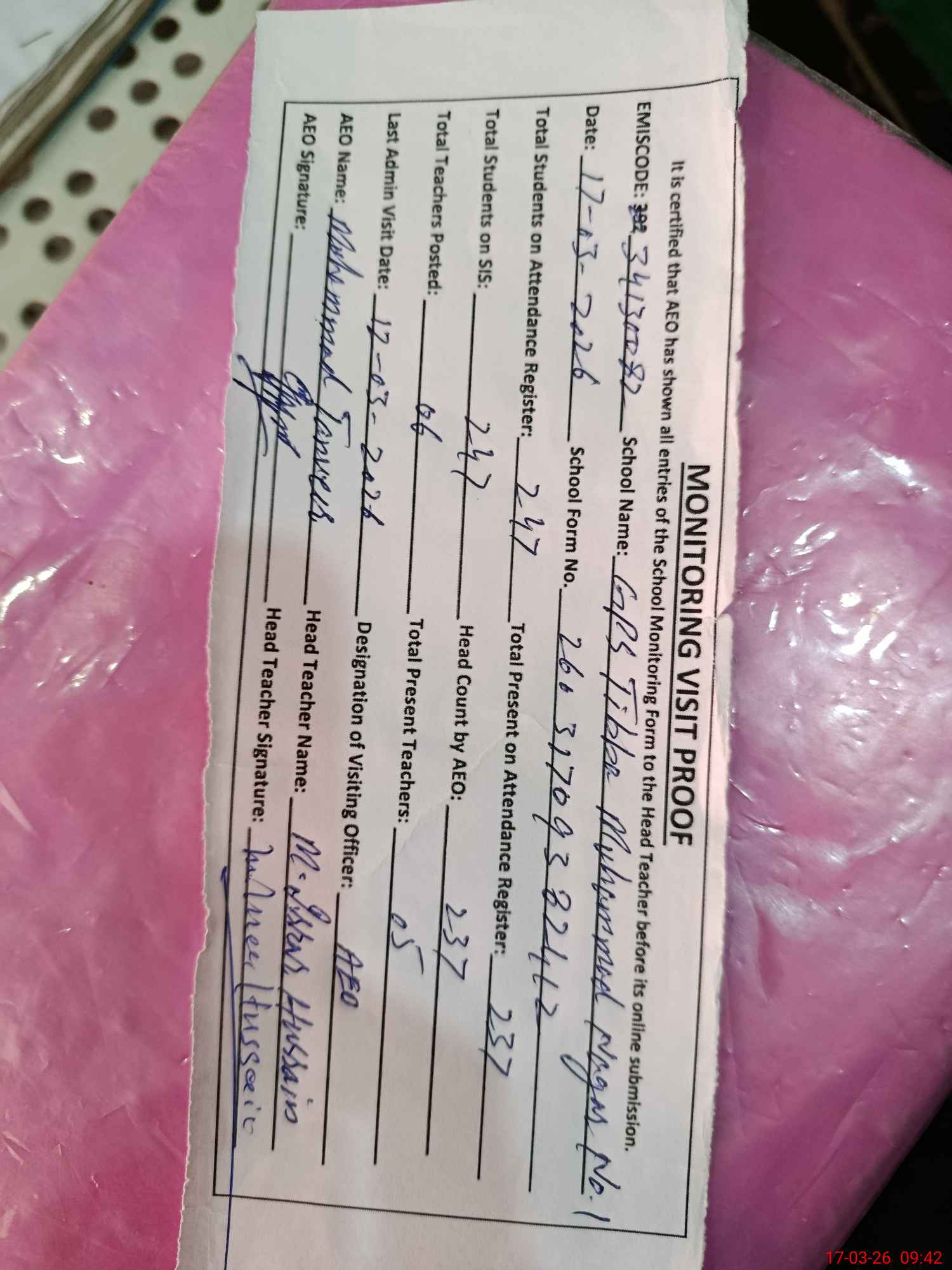 | Certified that this School was Inspected by the Undersigned MEA/DMO Today and the Information Stated Above is as Per Record. | |||||