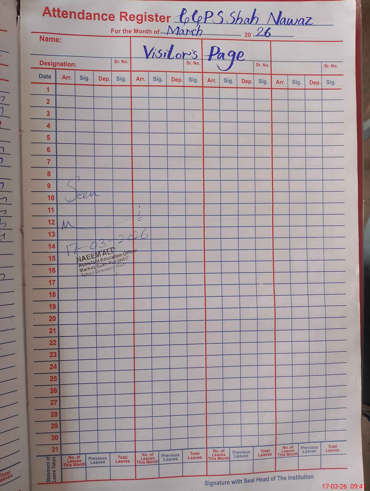 | Attendance Register | Head Teacher | MEA with School | Visit Proof |